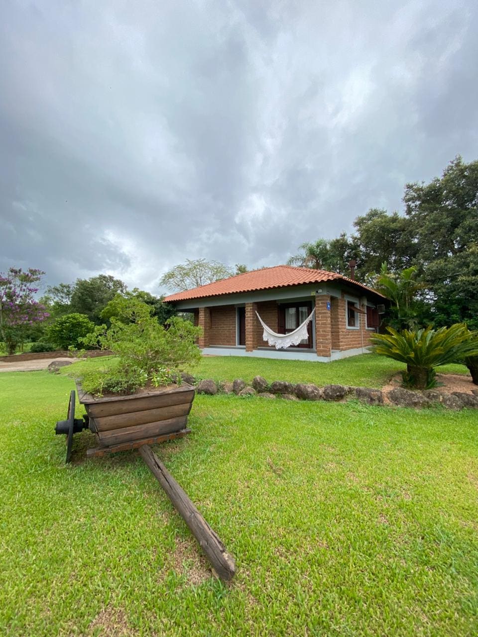 Casa de hóspedes completa, voltada para famílias. A casa acomoda até 6 pessoas. Possui 3 quartos, sendo uma suíte ampla e mais um banheiro Todo o espaço é climatizado. Possui smart tv, lareira e wi-fi. Cozinha completa com geladeira, fogão, air fryer, cafeteira e microondas, panelas, pratos, copos, talheres e utensílios básicos de cozinha. Sacada dos fundos coberta e com vista para o lago. Acesso a piscina da fazenda.