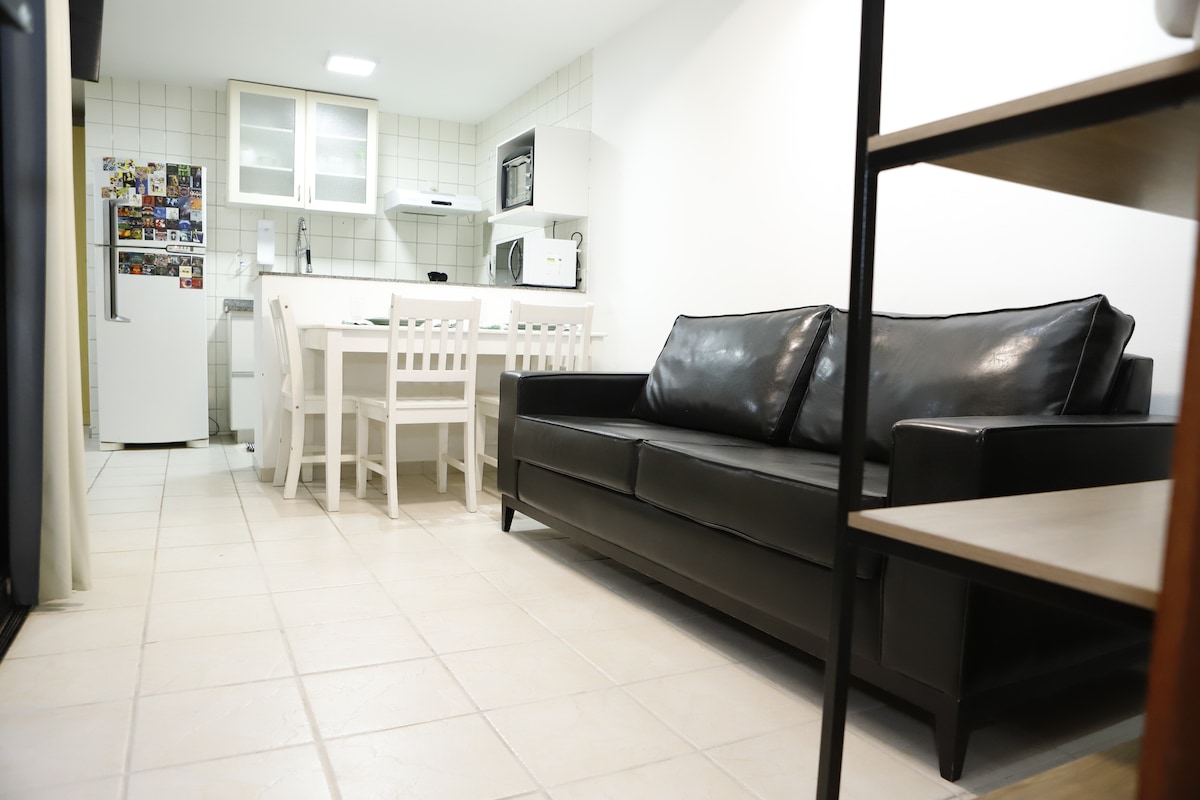 Encantador Kitnet bien dividido en dos ambientes. La habitación cuenta con una cómoda cama tamaño queen, ropa de cama nueva y toallas de baño y cara para los huéspedes. La cocina cuenta con ollas, utensilios de cocina, vajilla y cubiertos para tres personas. El apartamento también cuenta con aire acondicionado, nevera con congelador, microondas, Wi-Fi y TV por cable y sofá cama en la sala de estar. El condominio se encuentra a sólo 10 minutos del aeropuerto y del centro de Brasilia y al lado de un centro comercial y de la estación de autobuses.