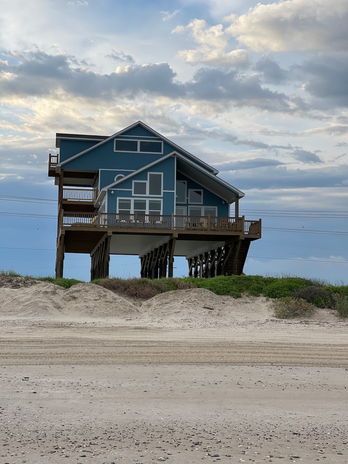 Unobstructed ocean views! See all the way down the beach to Galveston. Four bedrooms and 3 1/2 baths. Plenty of space and several decks for enjoying the sun. You have space to entertain, inside the beach home , but also underneath where you will find a large built in bar, propane/charcoal bar b q , swings, hammock loft and outdoor shower. Fenced in yard. Private walkover to the beach. Gourmet kitchen with butlers pantry. Tv's in every room. Master has soaking tub with beach view! Sleeps 14