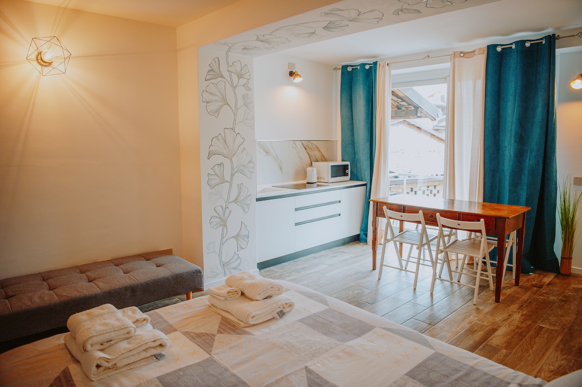 Elegante y luminoso estudio con zona de dormitorio, cocina equipada y baño privado con amplia ducha a ras de suelo. La decoración cuidada y los detalles decorativos dan un toque de estilo al ambiente, ideal para parejas que buscan comodidad y relajación cerca del lago de Garda. El estudio se encuentra dentro de un B&B con otras habitaciones. En la planta superior hay una gran terraza con vistas al lago.