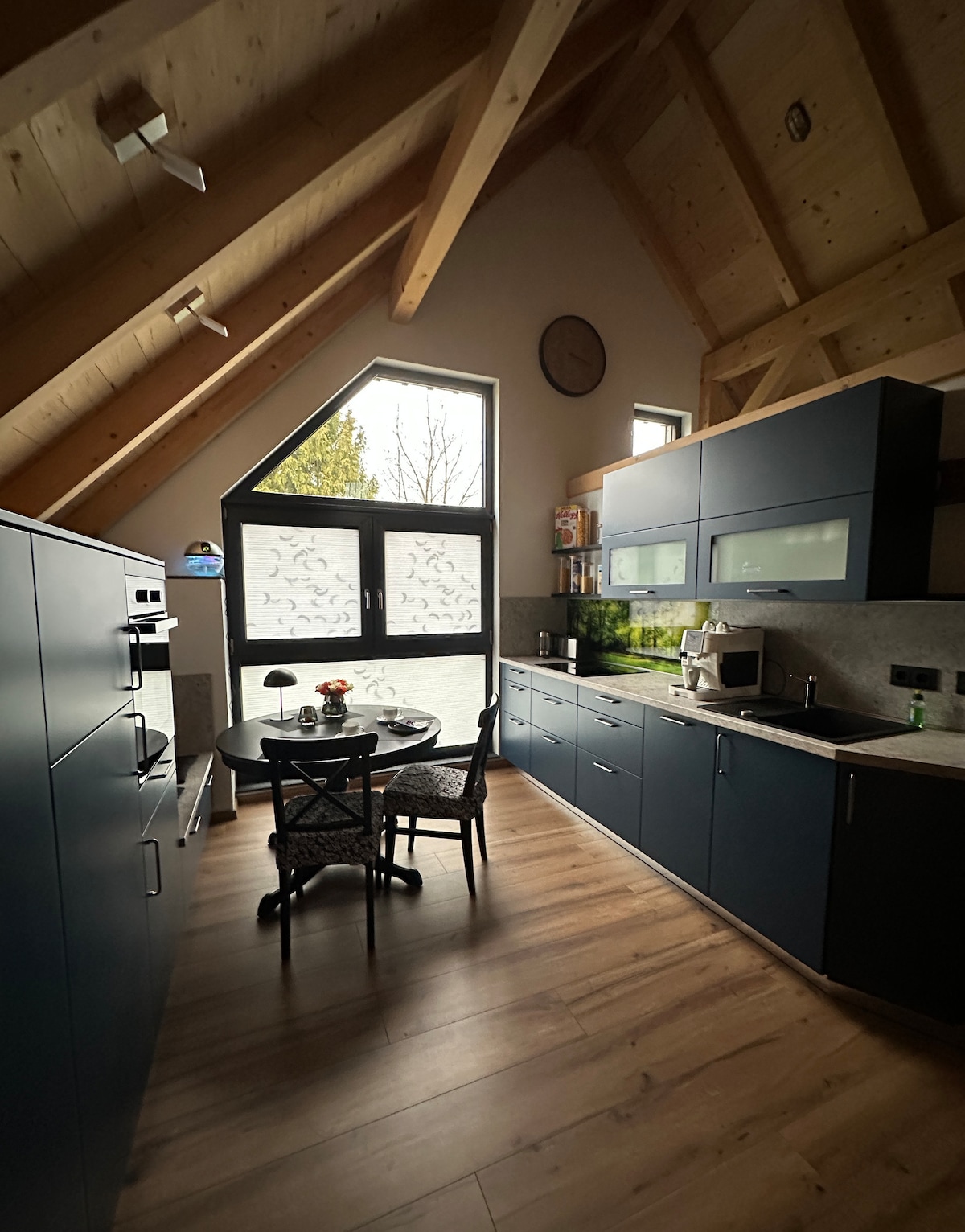 El apartamento en el último piso es realmente único. Se encuentra en el segundo piso y todo el lugar ha sido restaurado al edificio original. El marco de madera del techo original, el ladrillo visto, el suelo original y la estufa de madera totalmente funcional te ayudan a imaginar cómo vivía la gente a principios del siglo pasado. La sala de estar principal está orientada a la parte delantera de la casa y, por lo tanto, tendrás vistas a la plaza del pueblo, la casa del pueblo y la famosa roca de basalto «Jehla».