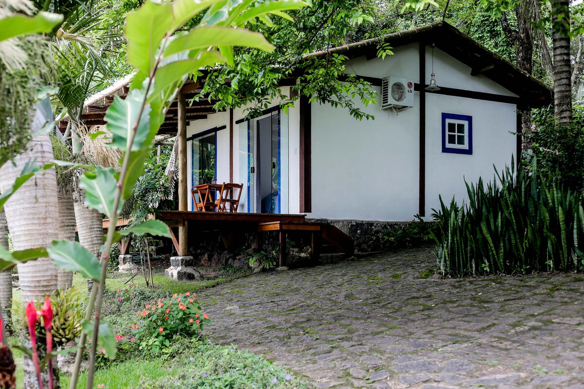 Un bungalow construido artísticamente en cada detalle... bañera abierta al bosque con techo de cristal dan la sensación de estar inmerso en la naturaleza, con una higuera centenaria al frente y muchas aves... íntimo y acogedor en conexión con la Naturaleza en contacto con esta zona de reserva de la Mata Atlántica. La otra ducha de hidromasaje está en la terraza abierta al bosque y es deliciosa de día o de noche con cielo estrellado y luna.