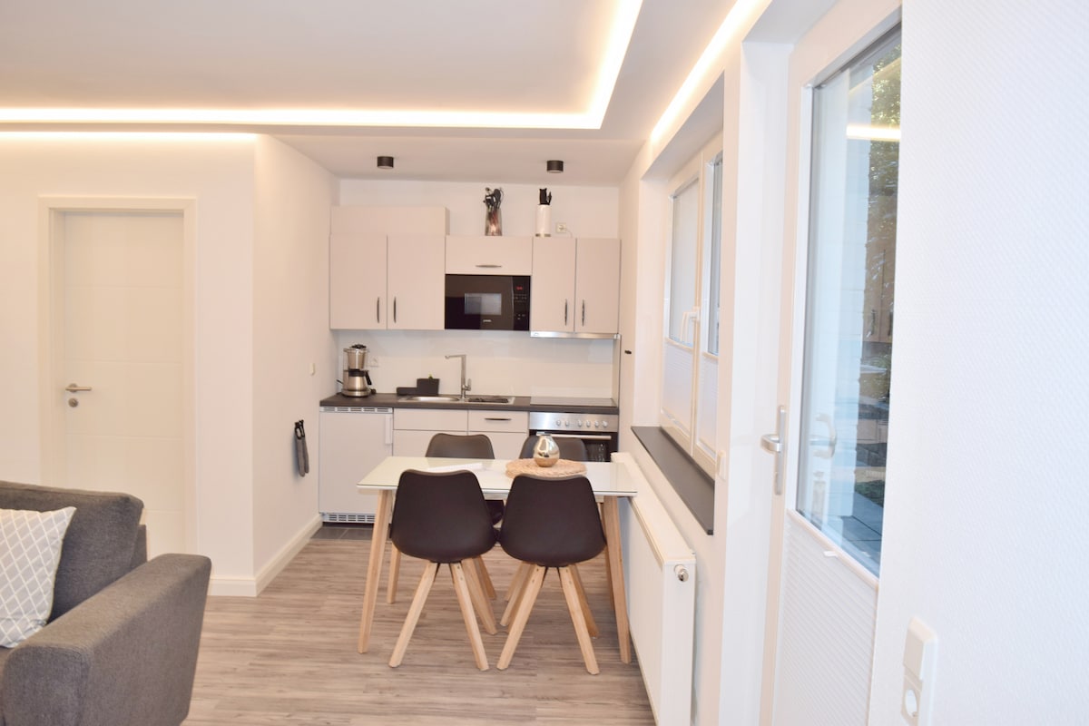 ¡Estamos encantados de daros la bienvenida a nuestro pequeño apartamento! El apartamento tiene unos 45 metros cuadrados. En el dormitorio hay una cama doble (140x200). Hay más opciones para dormir con el sofá cama (180x200) en la sala de estar. El apartamento está a vuestra entera disposición. Como anfitriones, vivimos en la casa principal de al lado y estamos disponibles para responder a sus preguntas en persona o por teléfono. Un aparcamiento se encuentra justo delante del apartamento.