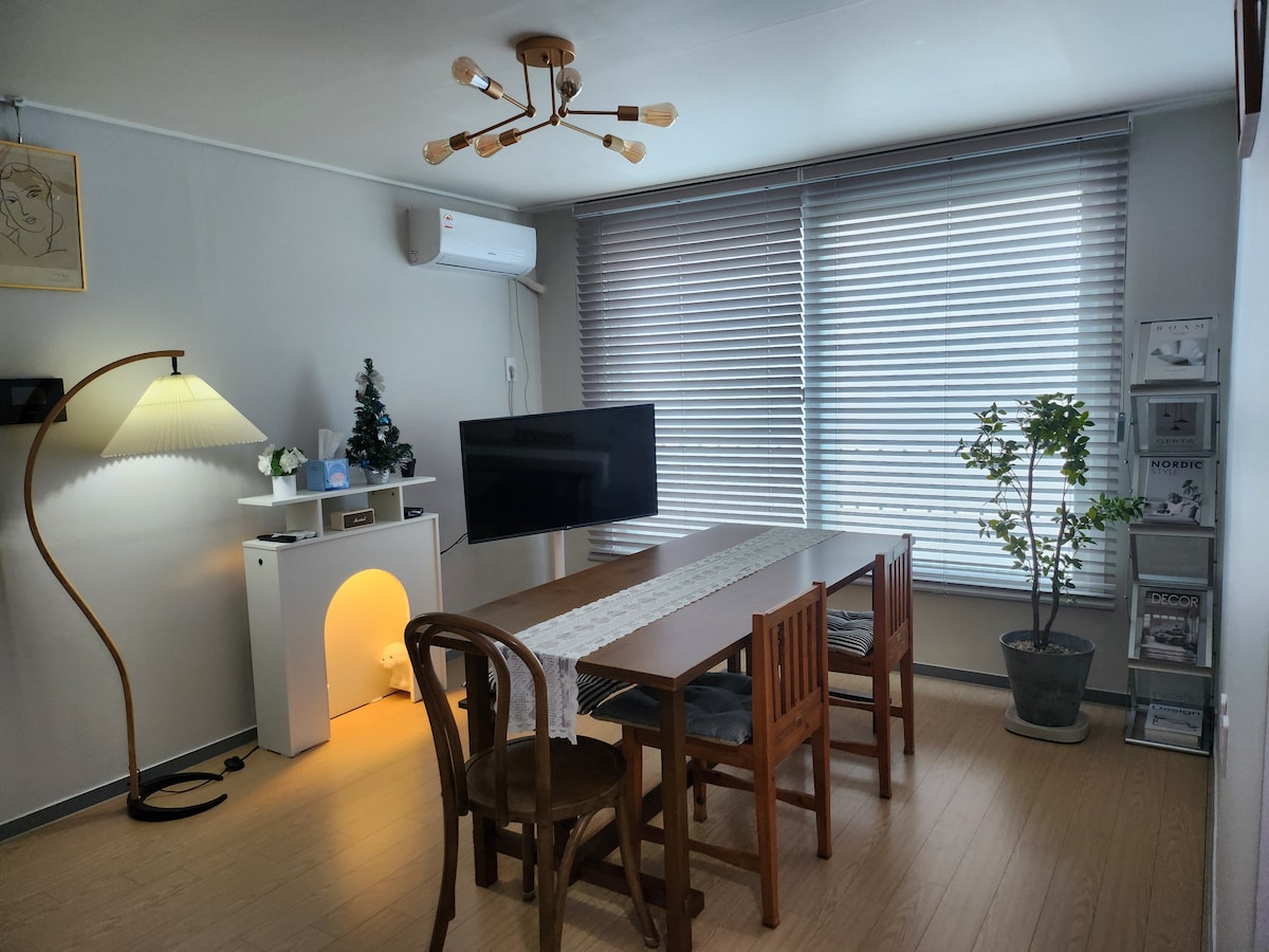 Te damos la bienvenida a “The middle 9th studio”. Hemos preparado un espacio para que te sientas como en tu propia casa. Para aquellos que vienen para estadías largas, viajes de negocios y viajes a Daejeon, hemos equipado cuidadosamente las herramientas de conveniencia necesarias, los electrodomésticos y varias necesidades diarias. ✔️ Un montón de espacio de vivienda y un dormitorio acogedor. Cocina ✔️ limpia y cómoda, totalmente equipada con utensilios de cocina básicos. Wifi y espacio de trabajo para ✔️ concentrarte en tu trabajo. (Sofá comedor) Electrodomésticos convenientes como lavadora, secadora, plancha de mano y lavavajillas ✔️ para huéspedes a largo plazo. No es solo un lugar para dormir, creamos un espacio de vida real. Lo hemos preparado cuidadosamente para que no te sientas incómodo durante un viaje de negocios o una estadía larga. Gracias por tu atención y uso. 🙏
