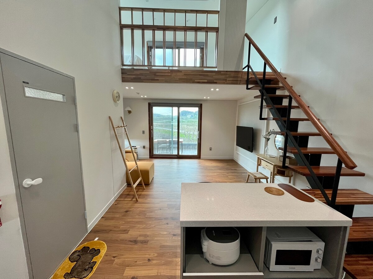 Es una nueva casa de dos pisos en un pueblo rural tranquilo. El primer piso está ocupado por los padres y el alojamiento funciona como una casa unifamiliar en el segundo piso. Puedes acceder al alojamiento por las escaleras exteriores, por lo que puedes hacer el check-in sin cara y puedes usar la barbacoa, el patio, el grifo, la terraza, etc. por tu cuenta ~ Tus padres son residentes, así que podemos responder de inmediato, como inconvenientes o solicitudes. Es rural, pero se puede llegar a la mayoría de los restaurantes, cafeterías, servicios y atracciones turísticas cercanos en 20 minutos en auto.(A 15 minutos de Sokcho Beach, a 6 minutos de Mulch Beach, a 6 minutos de Hanaro Mart, a 15 minutos de Sokcho E-Mart, a 15 minutos del teleférico de Seoraksan, a 10 minutos del templo de Naksa, etc.) Si usas una barbacoa o una tapa para ollas, el costo adicional es de 30 000 won. El carbón, la leña, las antorchas, las parrillas, etc. están disponibles, por lo que solo tienes que traer comida. También hay una mesa en la terraza, por lo que si quieres comer simplemente, puedes usar el quemador y la plancha. Hay un televisor inteligente en el primer piso, un mini proyector de haz en el segundo piso, Netflix, TV e inicio de sesión automático.