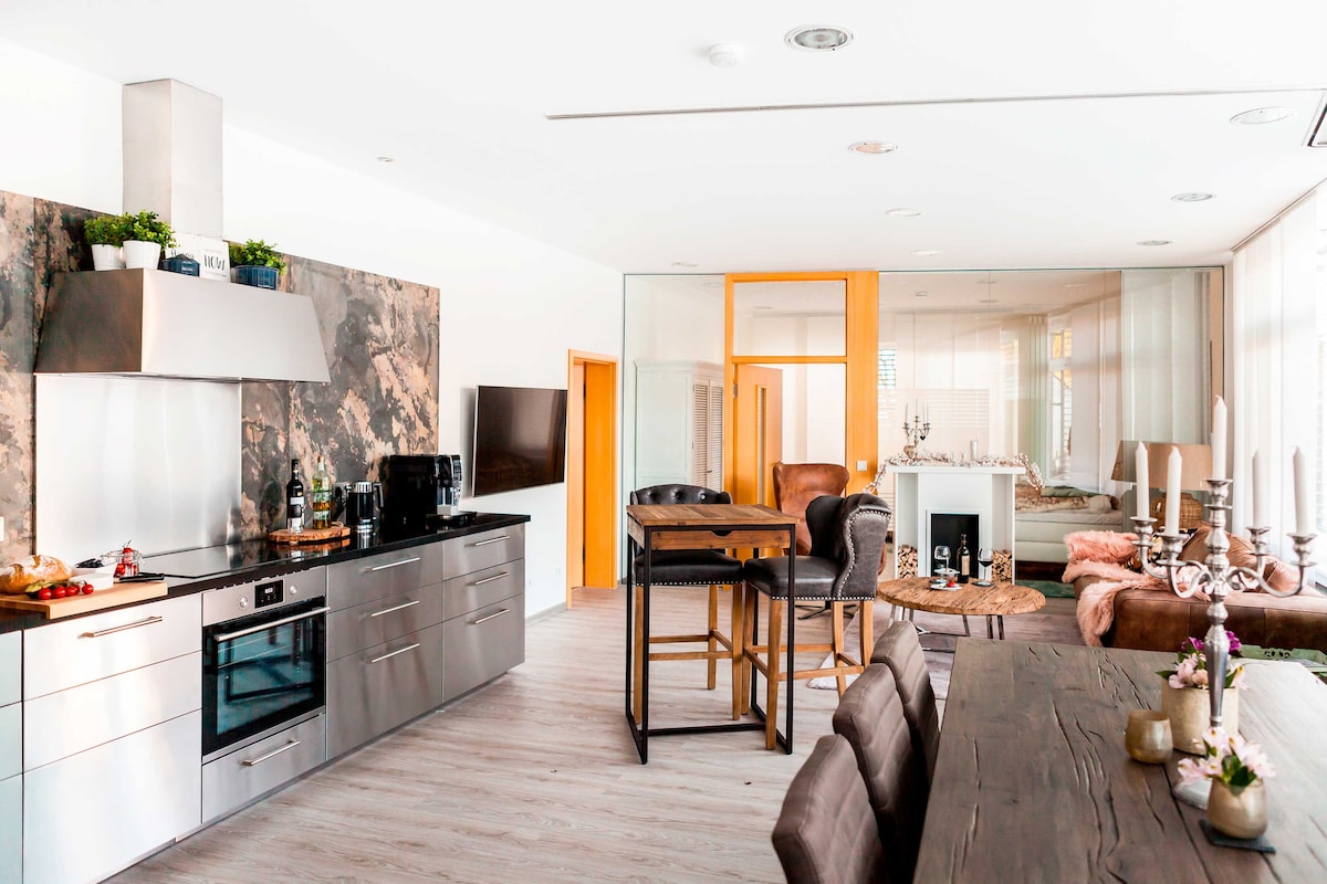 El RELAXLOFT - tu lujoso hogar en el corazón de la región de Eifel. Nuestro Relaxloft, equipado de forma exclusiva, ofrece una estancia de bienestar para un máximo de 4 personas. La cocina elegante y espaciosa no deja nada que desear. Cocinar juntos con amigos, charlar de forma relajada, reír a carcajadas, para los recuerdos más bonitos... El Relaxloft te ofrece todo lo necesario para unas relajantes vacaciones de bienestar combinadas con estilo de vida y un toque individual y acogedor. Todo es posible... no hay nada que hacer... Relax
