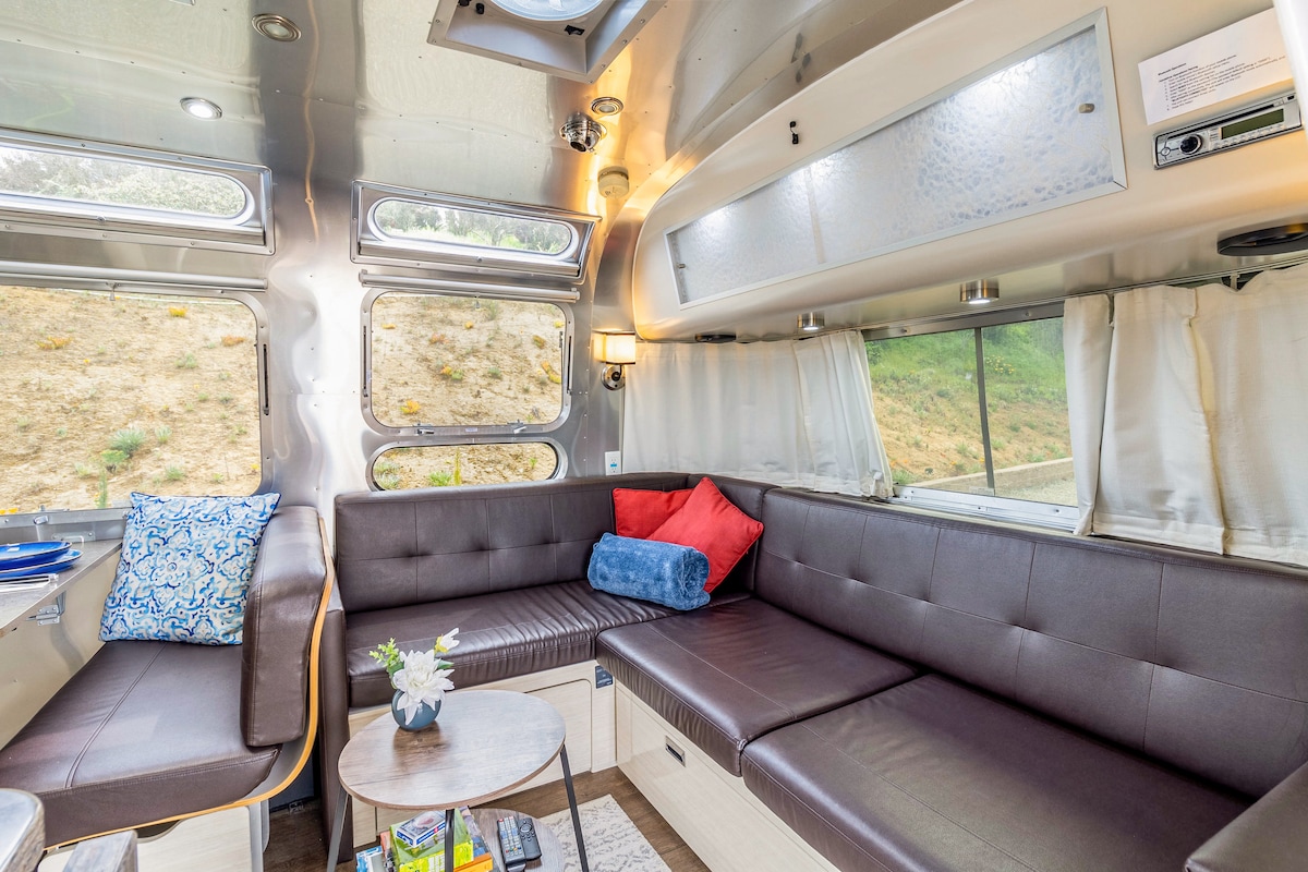 Glamping🌟 Desconéctate y relájate en un entorno sereno con impresionantes vistas a la montaña y amaneceres y puestas de sol inolvidables. Por la noche, maravíllate con los cielos llenos de estrellas, una de las características más mágicas de la zona. Tu refugio privado te espera en “Serenity”, un Airstream de 30 pies bellamente decorado. Pasa tus días descansando en el acogedor sofá cama tipi, o sumergiéndote en el jacuzzi contemplando las estrellas bajo el cielo abierto. Al caer la noche, acurrúcate con una copa de vino junto al fuego en nuestra amplia terraza flotante.