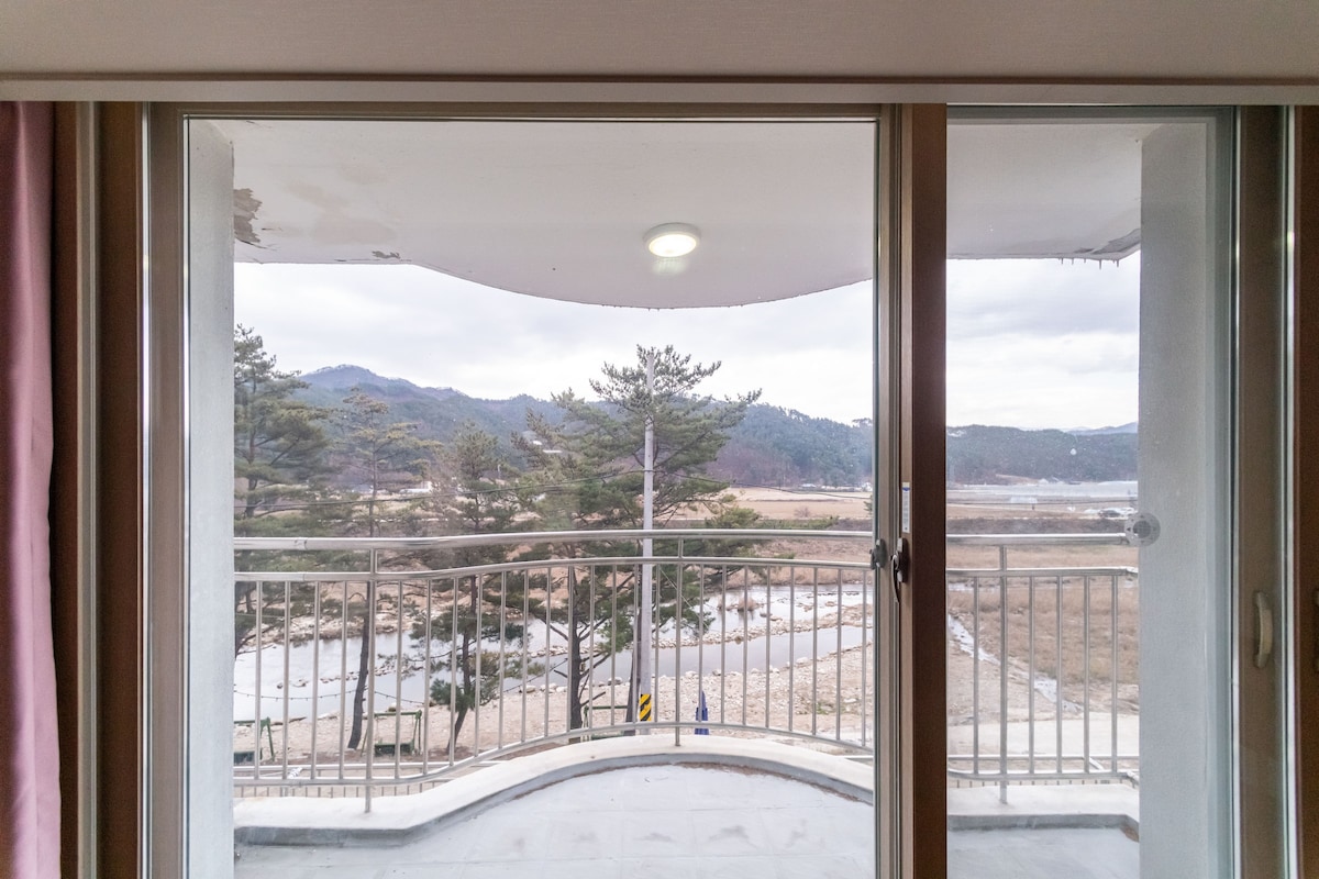 El famoso complejo turístico Well Hill Resort en Hoengseong, Gangwon-do, es el mejor lugar para disfrutar de un parque acuático de gran tamaño en verano y esquí y snowboard en invierno. El condominio con vista al slope del piso 12 del edificio principal es una habitación con 1 dormitorio grande, 2 salas de estar, 2 habitaciones pequeñas con paredes de piedra y 2 baños. A diferencia de otras habitaciones, tiene una cama nueva, un sofá y una cocina remodelada. Puedes llegar a la estación de esquí con solo tomar el ascensor y al parque acuático en 3 minutos a pie. También puedes utilizar el estacionamiento privado. Y ofrecemos cupones para descuentos en el parque acuático o en el telesilla.