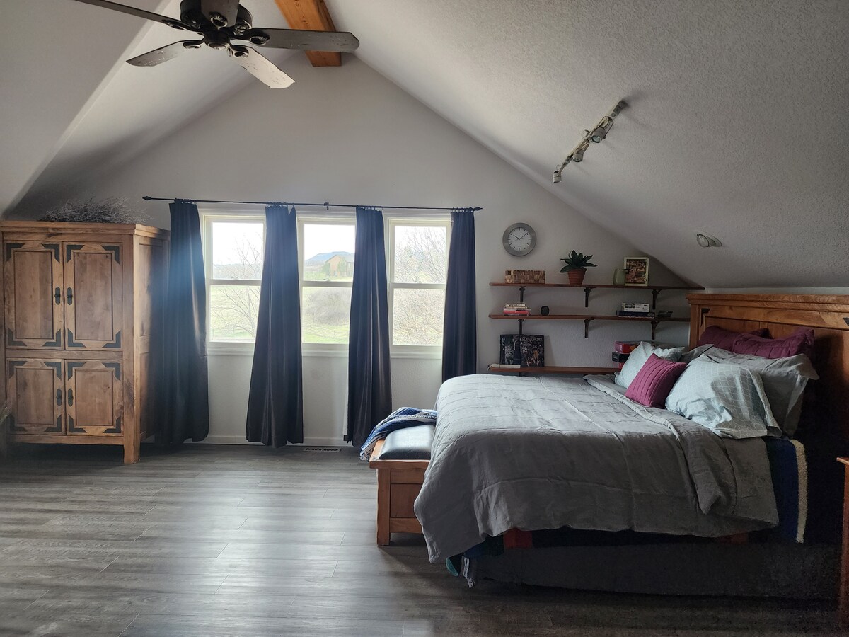 Relax with the whole family at this peaceful and cozy place to stay. Quite, tranquil, and scenic, yet close to town. Short drive to both the outdoors and ample shopping, our 1000 sq ft loft will provide you with a relaxed yet refined space to unwind after miles on the trail or pounding pavement at Castle Rock Outlets. Enjoy gorgeous sunsets over the Rockies with views from Longs Peak in RMNP to Pikes Peak in Colorado Springs. NO HIDDEN CLEANING FEES.