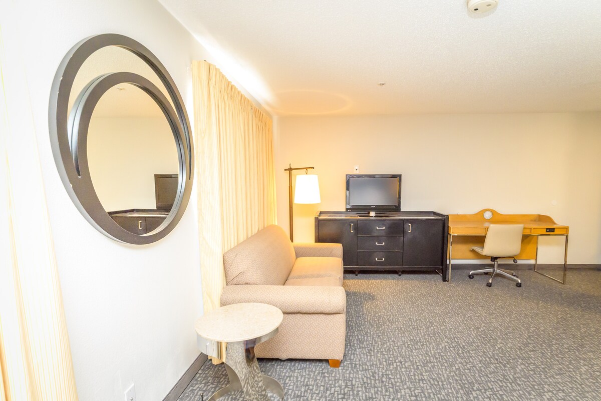 La habitación King estándar accesible cuenta con un diseño espacioso con una cómoda cama tamaño king y comodidades centradas en la accesibilidad. Los huéspedes se benefician de una ducha o bañera accesible, barras de seguridad y puertas anchas para facilitar el movimiento. Las comodidades modernas, como el wifi gratuito, un televisor de pantalla plana y un escritorio exclusivo, crean un ambiente acogedor para una estadía tranquila y cómoda.
