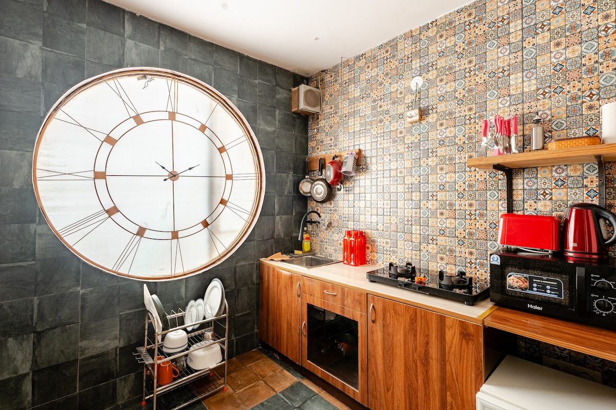 Ven a vivir conmigo y mi esposa en un diseñador totalmente independiente 1 bhk Hemos sido anfitriones desde 2017 y vivimos en el mismo edificio, por lo que siempre estamos cerca. El espacio está bien diseñado y muy bien cuidado, con una gran ventana para tomar el aire. El espacio cuenta con internet de 100 mbps y una cocina totalmente equipada, ropa de cama de calidad hotelera e incluimos la limpieza en la estancia de forma gratuita.
