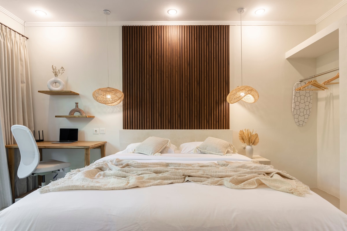 Ten en cuenta que la construcción está en progreso, ¡no hay estacionamiento! Felicidad junto a la playa en Sanur — Villa Cassandra • 3 elegantes habitaciones con aire acondicionado. • Baños en suite con comodidades de primera calidad, pantuflas y secadores de pelo • Cocina y comedor totalmente equipados. • Piscina privada grande. • Amplio patio y jardín. - Wifi de 300 Mbps. • Limpieza cada dos días con toallas y sábanas frescas. • Servicio de conserjería para reservaciones de spa, alquiler de scooters y más • PS5, Netflix, amenidades para niños y parrilla a pedido