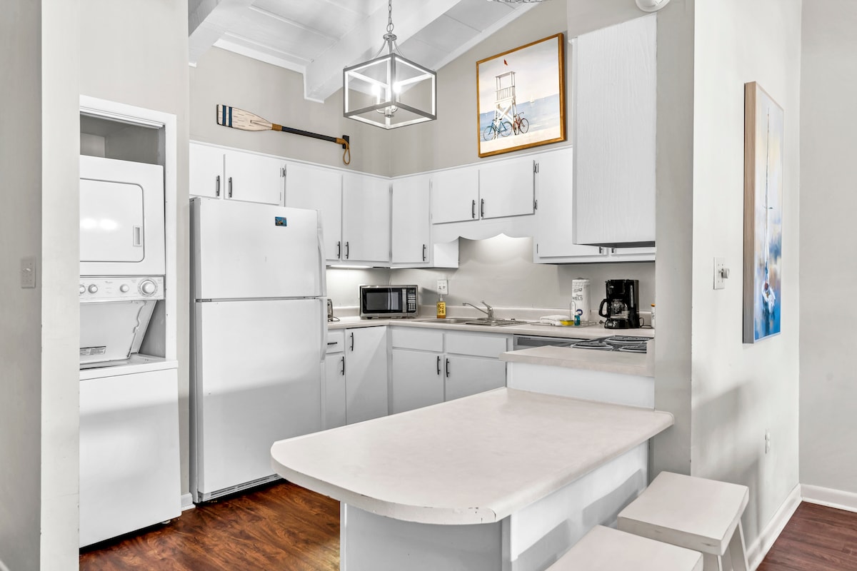 Ático en condominio (1650 pies cuadrados) Acceso privado a la playa (¡a 200 yardas de distancia!) Piscina Wifi rápido + Cable + Smart TV Cocina Totalmente Equipada A 5-10 minutos a pie de restaurantes populares Barrio seguro. Parrillas de carbón Vóley-playa Canchas de tenis y pickleball Aro de baloncesto Acceso a lavadora/secadora Aparcamiento en el lugar (3 plazas)