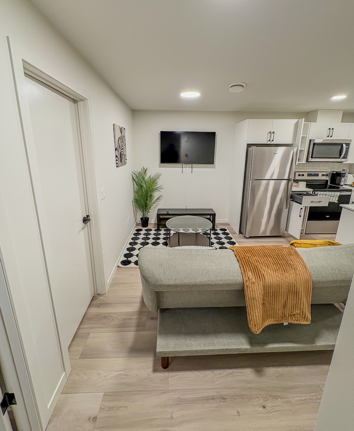 A estrenar, limpio y espacioso. Este apartamento de nivel inferior es un excelente lugar para un viaje de negocios corto o para una visita más larga. Es excelente para un viajero solo, parejas y familias de vacaciones. Tiene un hermoso dormitorio espacioso con una cama tamaño queen. Baño luminoso para todas tus 🤳 selfies y lavandería en la suite. Hay un colchón de espuma tamaño queen y un colchón inflable disponible para dormir más.