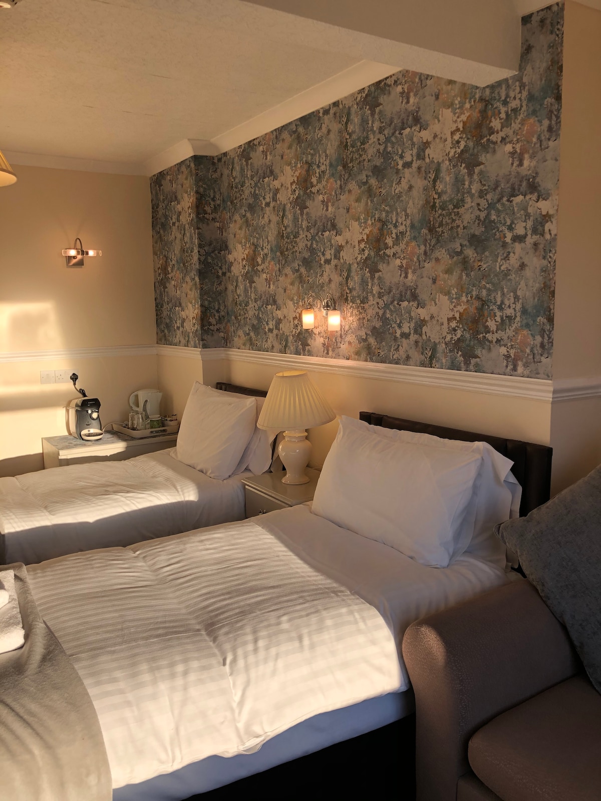 Un dormitorio más grande, cama tamaño king cómoda, baño privado, ventana, acceso para huéspedes por escaleras . nevera , instalaciones de té /café. Ventilador, calefacción. TV. Wifi . Aceptamos perros que se comportan bien por una tarifa de £ 12 por noche pagadera al reservar. Los niños solo se aceptan previa solicitud , se aplicará un cargo por noche. Revisa antes de reservar. Desayuno de cortesía de cereales, cruasanes , frutas y café disponibles en la sala de estar de los huéspedes. Desayuno cocinado a la carta en la cafetería/bar de la planta baja, de 9 a 5