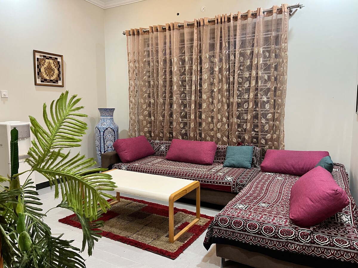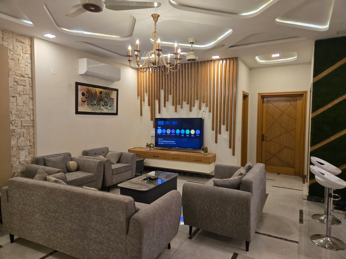 Welcome to our stylish two-bedroom suites in DHA 5 Islamabad. Enjoy the convenience of a quick commute and relax in a space featuring lovely decor and a fully-equipped home theater. Ideal for travelers seeking comfort and entertainment, this cozy retreat offers modern amenities in a prime location. It is a complete separate portion with it own separate entry and parking, family friendly, therefore very secure and peaceful. Parties & loud music is not allowed. Unmarried couples not allowed.