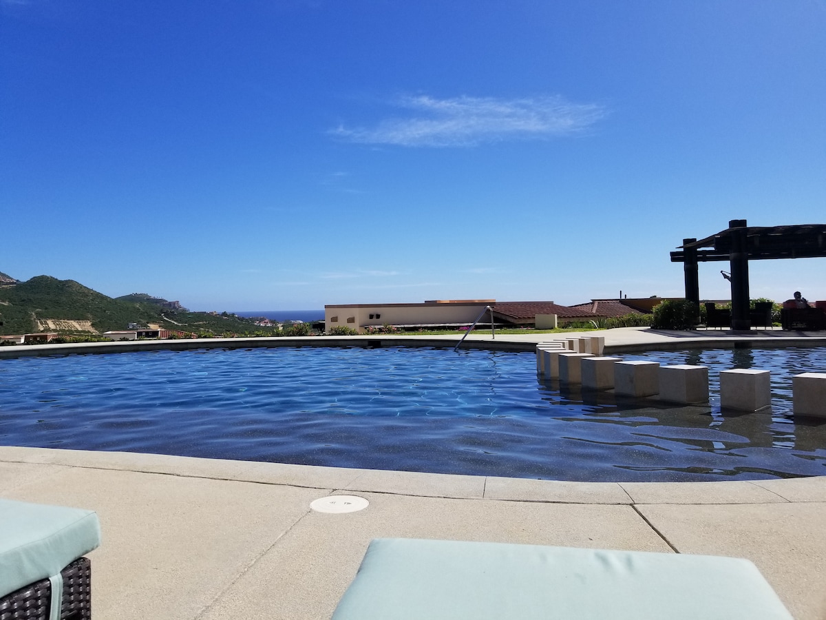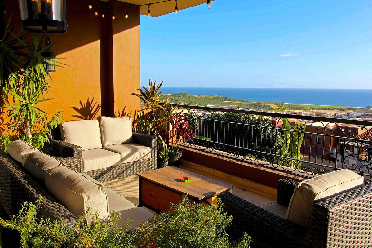 The condo's 180º view lets you enjoy sunrise and sunset at the Cabo Arch from your breakfast-dinner table! Terrace design offers intimacy and escape. Ideal for a romantic stay, home office with paradise views, BBQ dinners with sunset vistas, relaxing hammock siestas, whale-watching while cooking, and sunrise views from bed! Walking access to Cabo's top two beaches and next to The Cape and Thompson Hotel. Please remember, this is a rental condo, not a hotel, and the price reflects that.