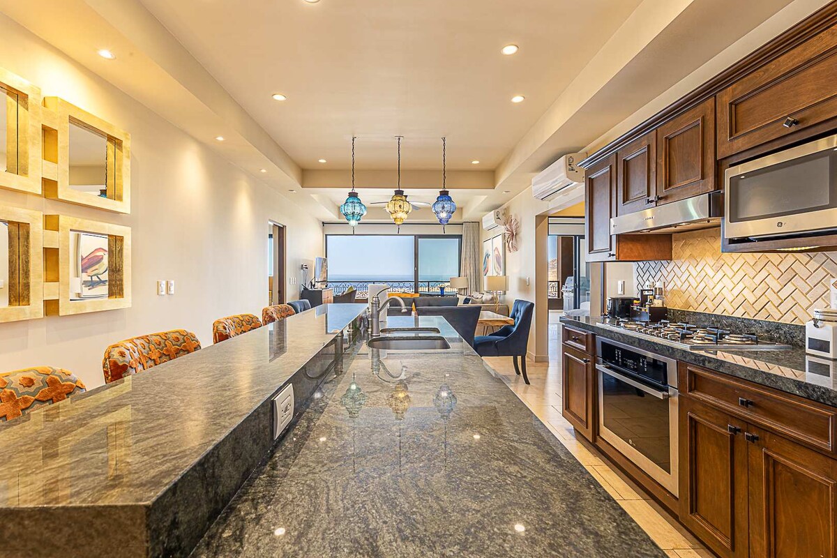 ¡Tus mejores vacaciones están aquí! Este es un excelente condominio de 3 dormitorios que tiene una vista perfecta del mar y del arco desde la suite principal, el balcón y la sala de estar. Disfrute y relájese en nuestro alojamiento con muebles cómodos, una cocina totalmente equipada y excelentes áreas compartidas interiores y exteriores. Con comodidades estilo centro turístico y proximidad a las atracciones del centro y a La Marina, este es el mejor condominio para su escapada a Cabo.