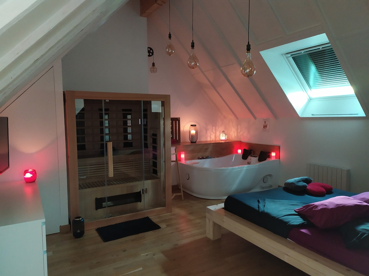 Situado a 10 minutos del centro de la ciudad de Dijon, le propongo vivir un momento de relajación y complicidad para dos, en un capullo minuciosamente confeccionado para usted. Un jacuzzi único con un confort y un diseño de alta gama, un perfil ético exclusivo para optimizar un masaje relajante. Una sauna, un excelente antiestrés que fomenta la relajación de los músculos y estimula la circulación sanguínea. Una cama de lujo, con un contacto envolvente y un apoyo firme para una noche encantadora.