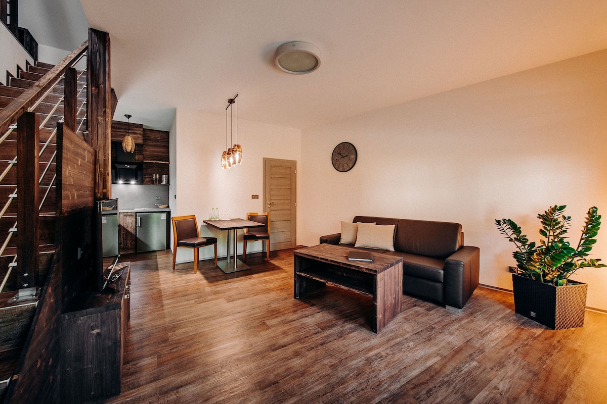 El apartamento Thomas ofrece la planta baja con un loft, donde en la planta baja hay una cocina americana, sala de estar y baño. Un dormitorio espacioso está ubicado en el loft. Es posible desplegar un sofá de cuero en el apartamento, desde el que se creará una cama adicional de tamaño completo (para un máximo de 2 personas). El precio de la estancia incluye DESAYUNO y sauna privada con baño, un sendero Kneipp al aire libre (solo en los meses de verano), un parque infantil multiusos (tenis, voleibol), una parrilla eléctrica WEBER, la posibilidad de usar un parque infantil o pelotas para niños.