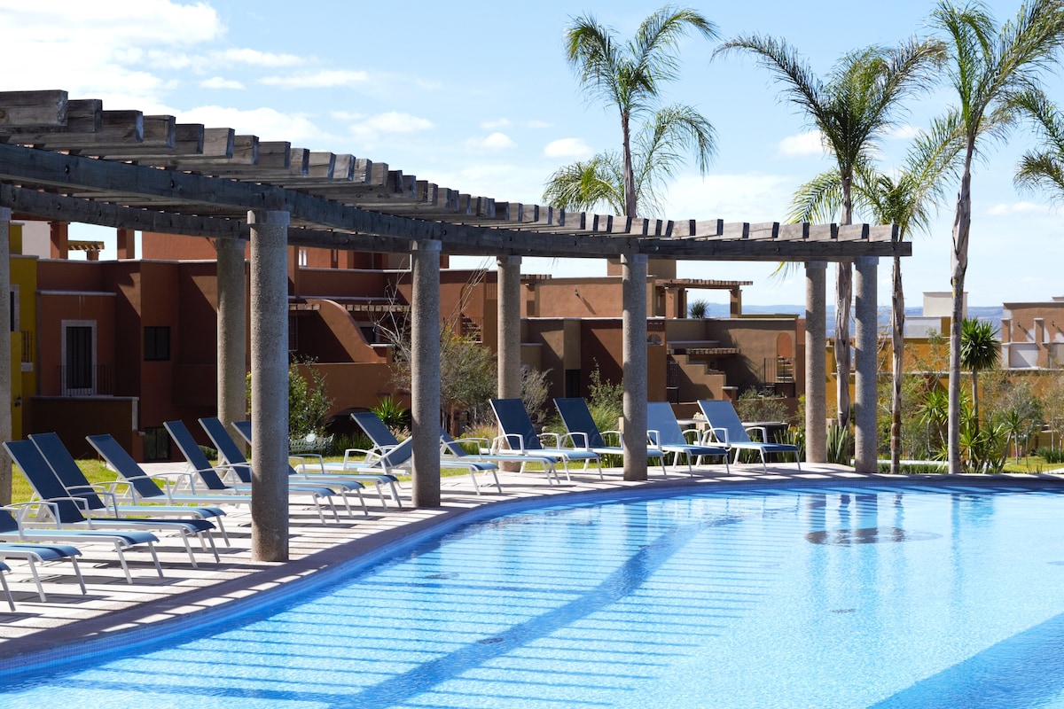 Hermoso apartamento con 2 recámaras y 2 baños en el Fraccionamiento 5 Estrellas "La Luminaria Casonas y Villas" en San Miguel de Allende. Perfecto para descubrir y vivir al máximo tu estadía aquí, disfruta de todas las amenidades: - Alberca Principal 25 - 27 ºC - 3 Albercas de relajación 31 °C - Gimnasio - Spa - Jacuzzi 35 - 39 °C - Co-working - Canchas de tenis - Lavandería - Restaurante, y mucho más. ***Por lo menos 2 adultos mayores de 30 años.