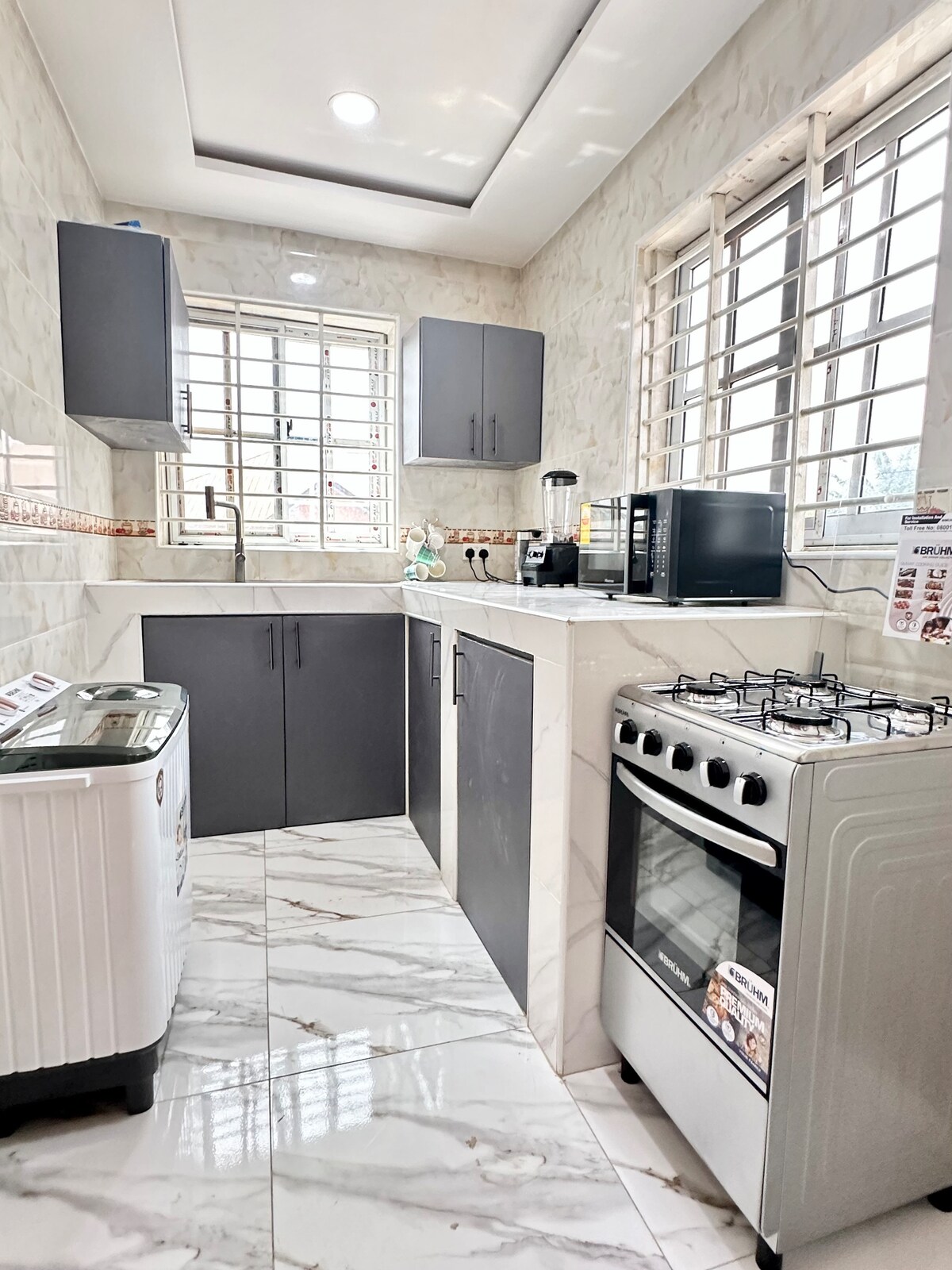 ¡Tu hogar lejos de casa en Accra! • Departamento de 2 dormitorios en una pequeña comunidad cerrada • A 15 minutos en coche del aeropuerto. • A 15 minutos en auto del centro comercial Accra Mall. • A 8 minutos en auto de ANC Mall y cerca restaurantes • A 5 minutos a pie de tiendas de conveniencia y una farmacia. • Generador en espera disponible.
