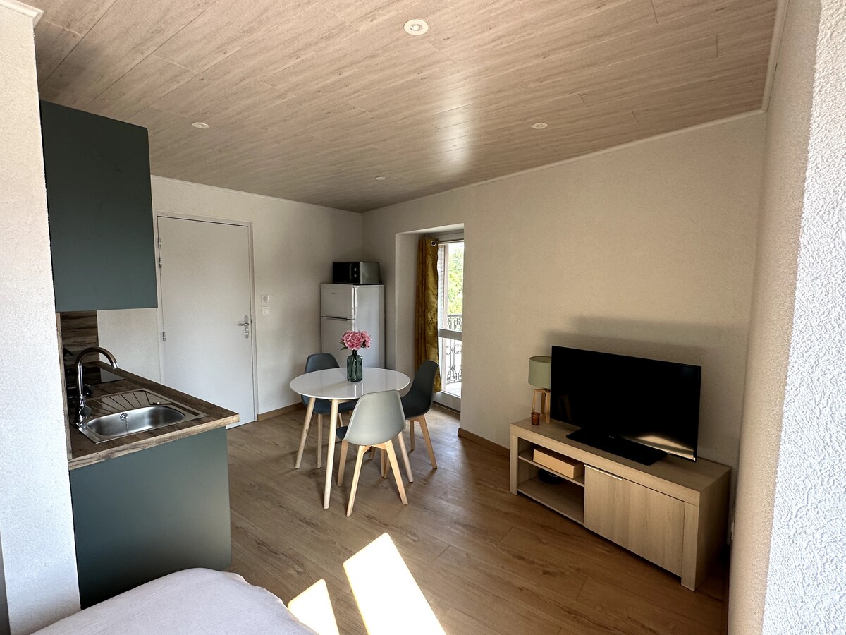 Bonito apartamento de 60 m² reformado con piedras a la vista y chimeneas del siglo XVI. Amistoso, cálido y contemporáneo a la vez con todas las comodidades modernas. Encontrará: cocina equipada abierta a un salón cómodo y espacioso con TV y Wifi. Dormitorio separado con 1 cama de 160, baño con toalla seca. Entrada, estacionamiento y terraza privados. Madera incluida.