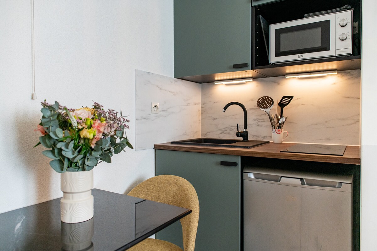 ☀️ Bienvenido a este estudio, luminoso, tranquilo, funcional y perfectamente equipado. Ya sea para una estancia corta turística o profesional, encontrará todas las comodidades necesarias para sentirse como en casa. 🛏 Comodidad y equipamiento - Ropa de cama de calidad hotelera de 160 x 200 cm (queen size). - Se proporcionan sábanas y toallas - Cortinas opacas para noches tranquilas - Ventilador disponible