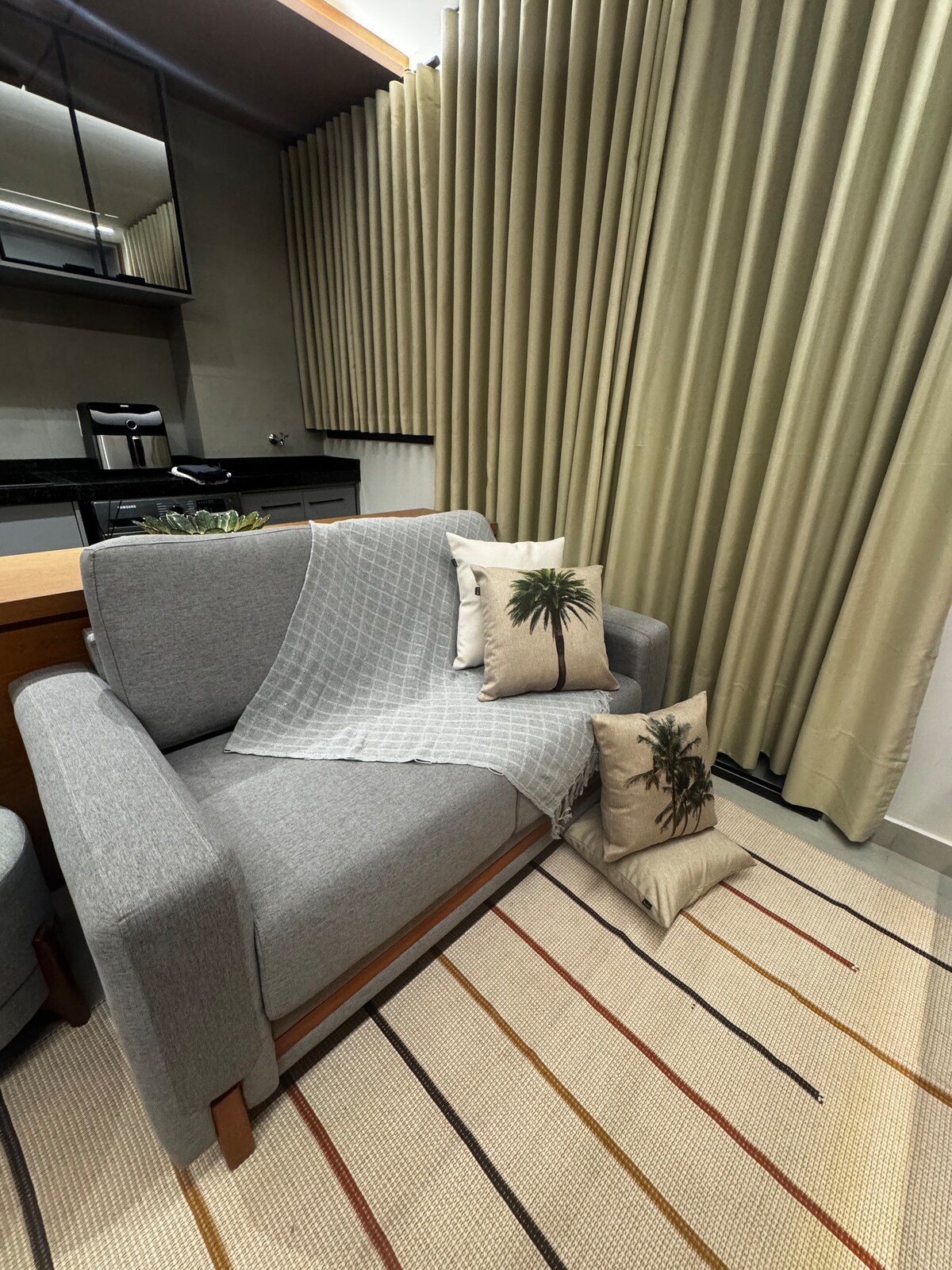 Estudio con decoración de alto estándar pensado para estancias cortas o largas. Perfecto para parejas, personas que viajan solas por placer/trabajo. Estructura para hasta 2 personas. Apartamento a 200 metros del mercado, bares, farmacias y restaurantes.