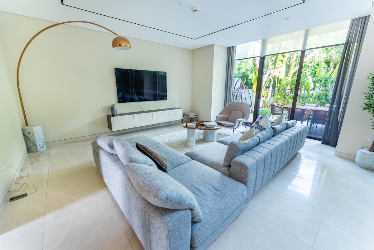 Esta moderna y lujosa villa de 5 dormitorios tiene capacidad para 9 huéspedes. Disfruta de 5 baños elegantes, una cocina de planta abierta con electrodomésticos de última generación y amplias salas de estar y comedor. Relájate en la cocina al aire libre con barbacoa integrada, un cómodo sofá y una piscina de agua dulce. Ubicado en Dubai Hills Estate, está a solo 15 minutos del centro de Dubái, con limpieza y desinfección quincenales para una estancia impecable y sin estrés. Es un hogar perfecto lejos del hogar, con cada detalle diseñado para tu comodidad y privacidad.