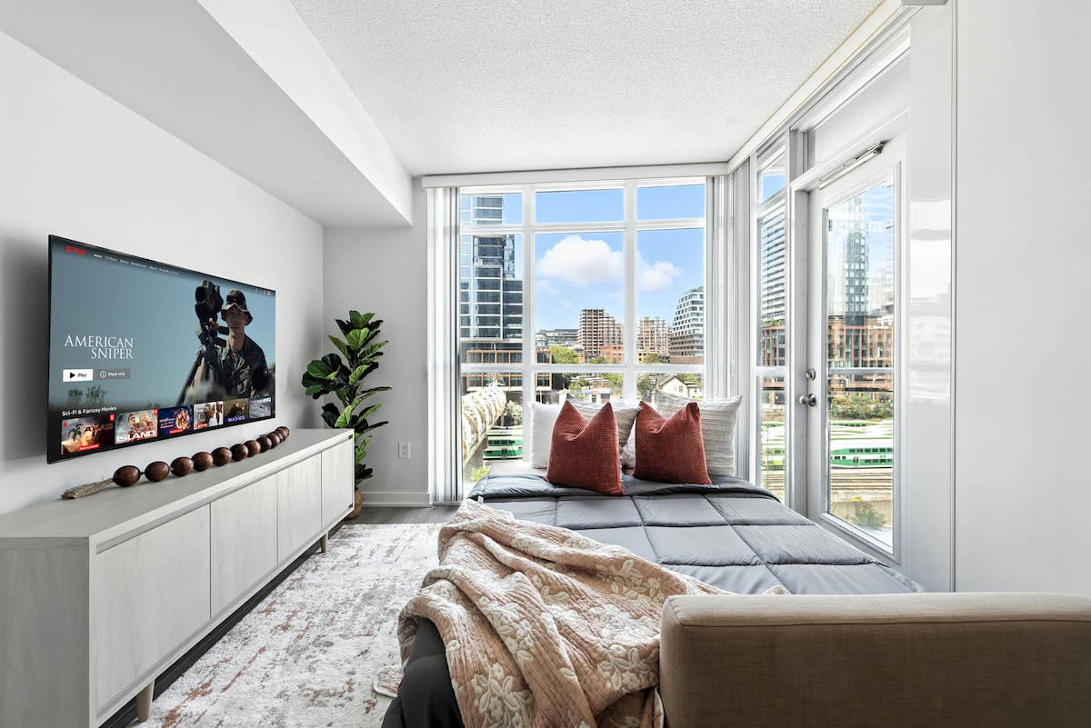 Disfruta de Toronto con estilo desde este apartamento luminoso y moderno de 1 dormitorio (+1 sofá cama) en el corazón del centro de la ciudad. Ubicado en el vibrante CityPlace, estarás a solo unos pasos de la Torre CN, Rogers Centre, BMO Field, el aeropuerto Billy Bishop, el paseo marítimo y el tranvía TTC. Disfruta de una cocina totalmente equipada, un acogedor espacio de estar con Netflix, Wi-Fi de alta velocidad y lavandería en la suite. A pesar de su gran puntuación a pie, se incluye estacionamiento gratuito. Disfruta de azúcar, sal, pimienta y café de cortesía para tu comodidad.