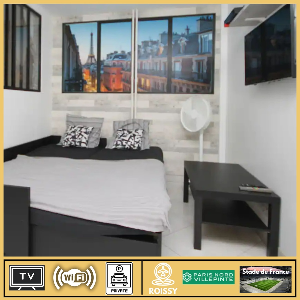 Hermoso estudio que ofrece tranquilidad completa y cómodamente acomoda a 2 huéspedes dentro de un edificio seguro. El departamento no es accesible para personas con movilidad reducida. Servicios: Ropa de cama, wifi, Netflix, lavadora, plancha, secador de pelo, Nespresso. Limpieza profesional. Acceso directo al transporte público. Acceso: A 10 minutos a pie de la estación de Le Bourget RER En transporte público: A 20 minutos de Gare du Nord (París) A 35 minutos de Châtelet (París 1) A 30 minutos del aeropuerto CDG. A 45 min de la Torre Eiffel