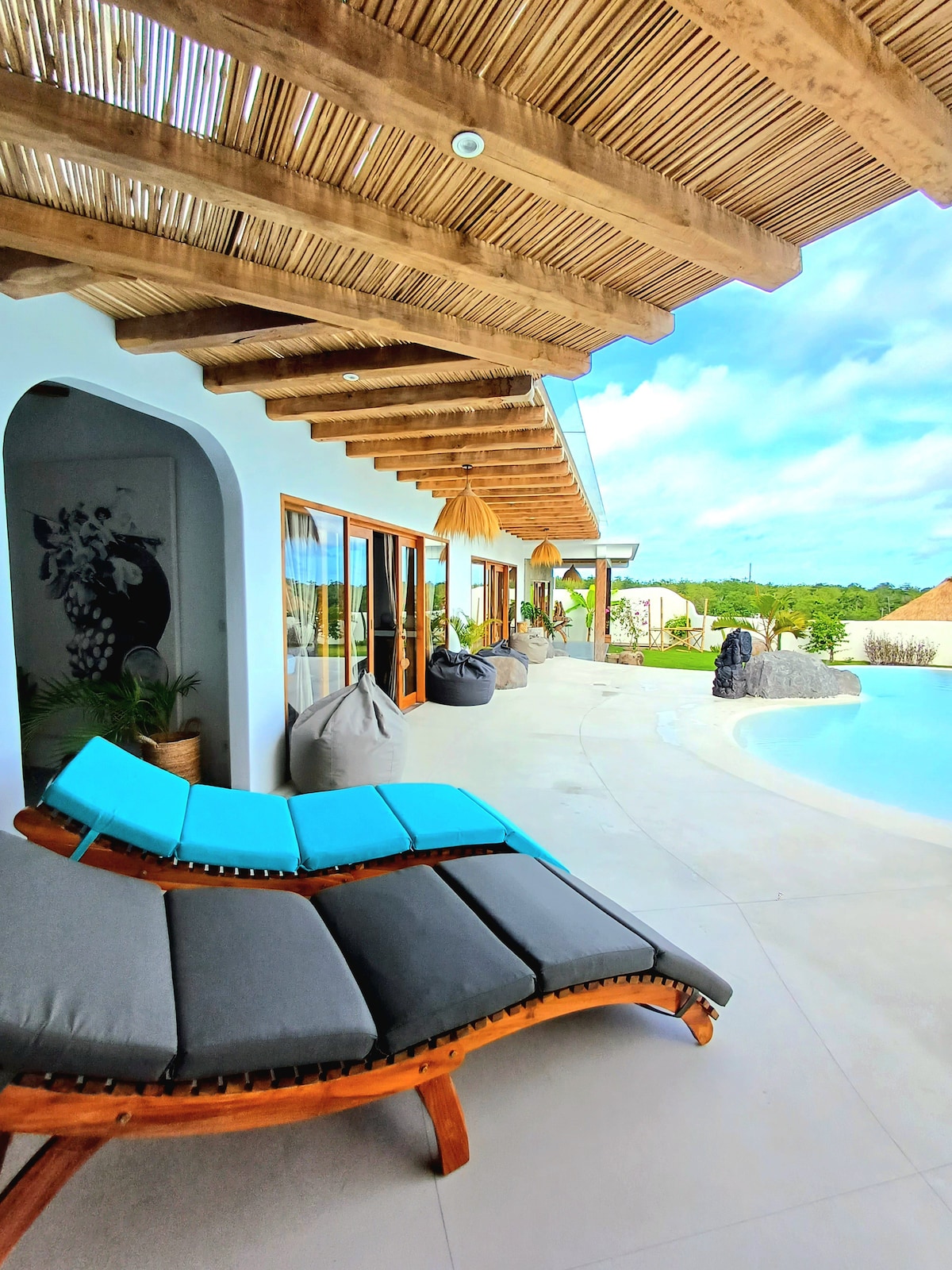 Habitación estándar 4: esta acogedora pero refinada habitación te invita a relajarte en tu propia piscina privada y oasis de jardín. El elegante diseño combina el minimalismo tropical y la belleza cruda, utilizando materiales naturales y una paleta suave y terrosa para crear una energía armoniosa. El techo de alang-alang filtra la luz maravillosamente mientras mantiene el interior fresco y relajante. Ya sea que te estés relajando en la terraza de madera o flotando en la piscina, la habitación 4 ofrece una conexión sin esfuerzo con la naturaleza.