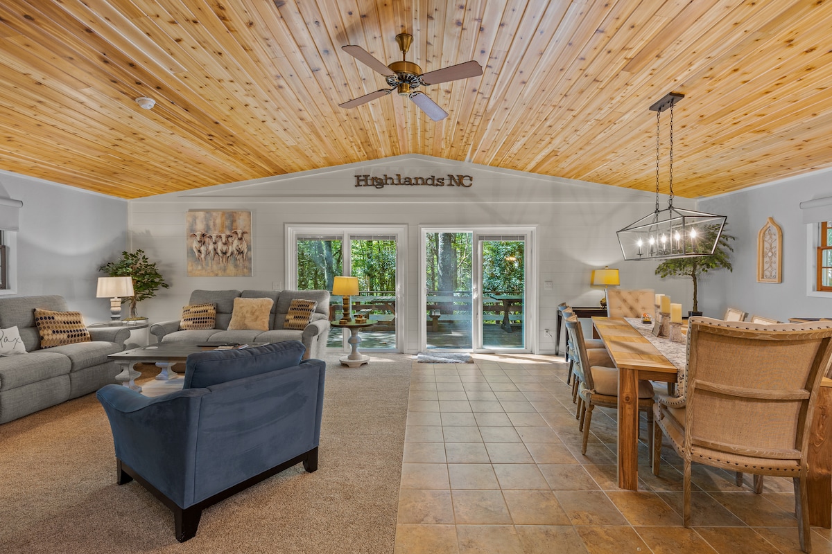 *Dos dormitorios: cama tamaño king en el principal, 2 individuales en el otro. *Chimenea de leña. * Fogata al aire libre *Terraza trasera con vistas * Entorno privado, tranquilo y pacífico. *Cocina totalmente equipada. *¡Cerca de deportes de invierno, cascadas, senderismo, el lago Glenville, excursiones en tirolina, posavasos alpinos, golf, spas, pesca, tiendas, restaurantes fabulosos y más! *Conveniente tanto para Highlands como para Cashiers * Equipo para bebés/niños: pack-n-play, asiento elevador, taburete escalonado, vajilla para niños, fundas de enchufes, cerraduras para gabinetes, libros, juguetes, juegos