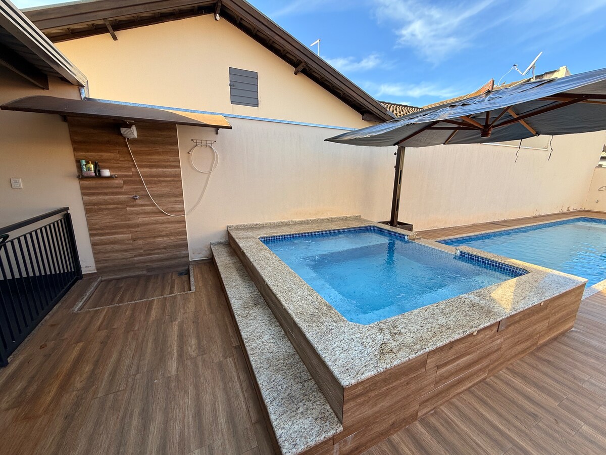 Este es el pequeño rincón que hicimos para el ocio con nuestro hijo y que ahora compartimos contigo. Tenemos un edículo totalmente amueblado, con una gran zona exterior con barbacoa y una deliciosa piscina para relajarse, en dos niveles, con un SPA en la parte más alta y otro tipo de rayo en la parte inferior, con una sombrilla para asegurar la sombra en las horas más calurosas. Nuestra piscina está completamente cercada para garantizar la seguridad de nuestros pequeños.