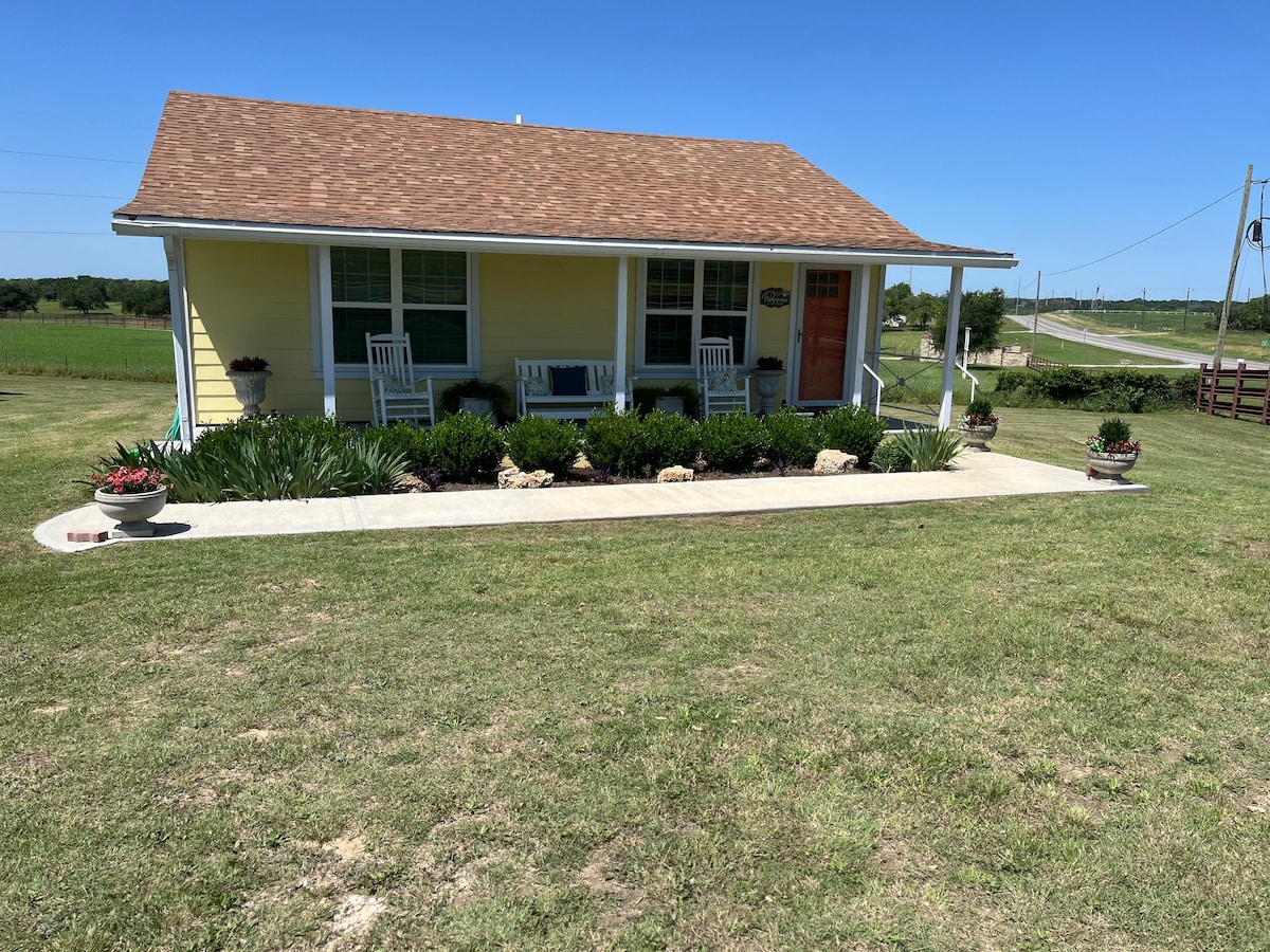 Enjoy a rural setting in the heart of cowboy country. Room to bring a horse and relax in quiet while being able to travel to many amenities surrounding Stephenville, Texas. (We're 2 miles out of town) Our new tiny home has a comfy bed, kitchen, and a place to kick off your shoes and relax. Come enjoy a fire outside, sit on the porch, or go for a ride in the area. Small dogs allowed with pre-approval. This includes a $20 pet fee. Up to 3 horses allowed with pre-approval and horse fee.
