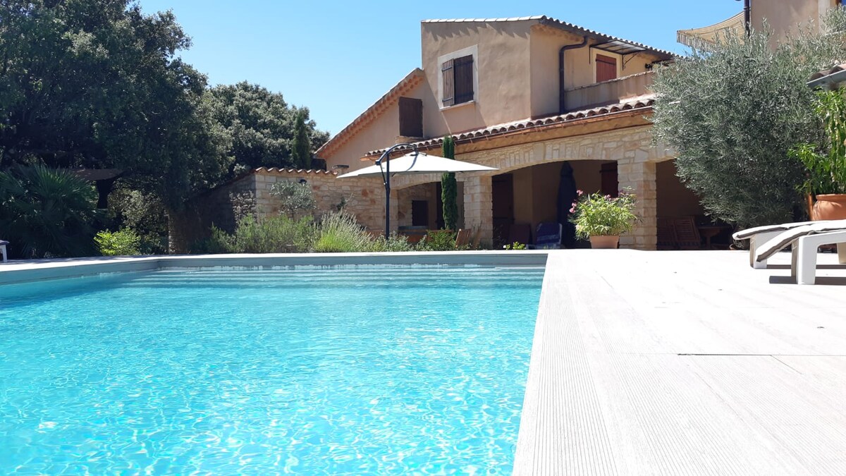 Acogedor estudio para 2 personas: cama bultex, zona de oficina, acceso independiente, sin vecinos, internet, aire acondicionado, impresionantes vistas a la llanura. Usted utilizará: cocina equipada en el alojamiento, piscina compartida abierta de abril a octubre en el jardín. Se proporcionan sábanas y toallas Estacionamiento privado en el lugar Caja de llaves llegada autónoma posible. A 35 minutos de Nîmes y Montpellier