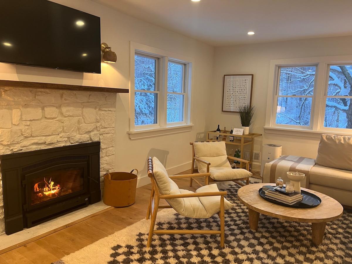A poco más de una hora de la ciudad de Nueva York, este aislado chalet frente al lago, que admite perros, ofrece 200 pies de costa privada, patio cercado y solárium con serenas vistas al lago. Diseñado cuidadosamente con piezas recopiladas de mis viajes, combina el lujo tranquilo con la comodidad moderna. Acogedor junto a la chimenea, disfruta de vinilo o una película, mira la nieve, observa la vida silvestre, explora los senderos cercanos, relájate junto a la fogata y descansa en la cama tamaño king. Romántico, tranquilo, bellamente aislado: tu escapada perfecta al lago en invierno te espera.