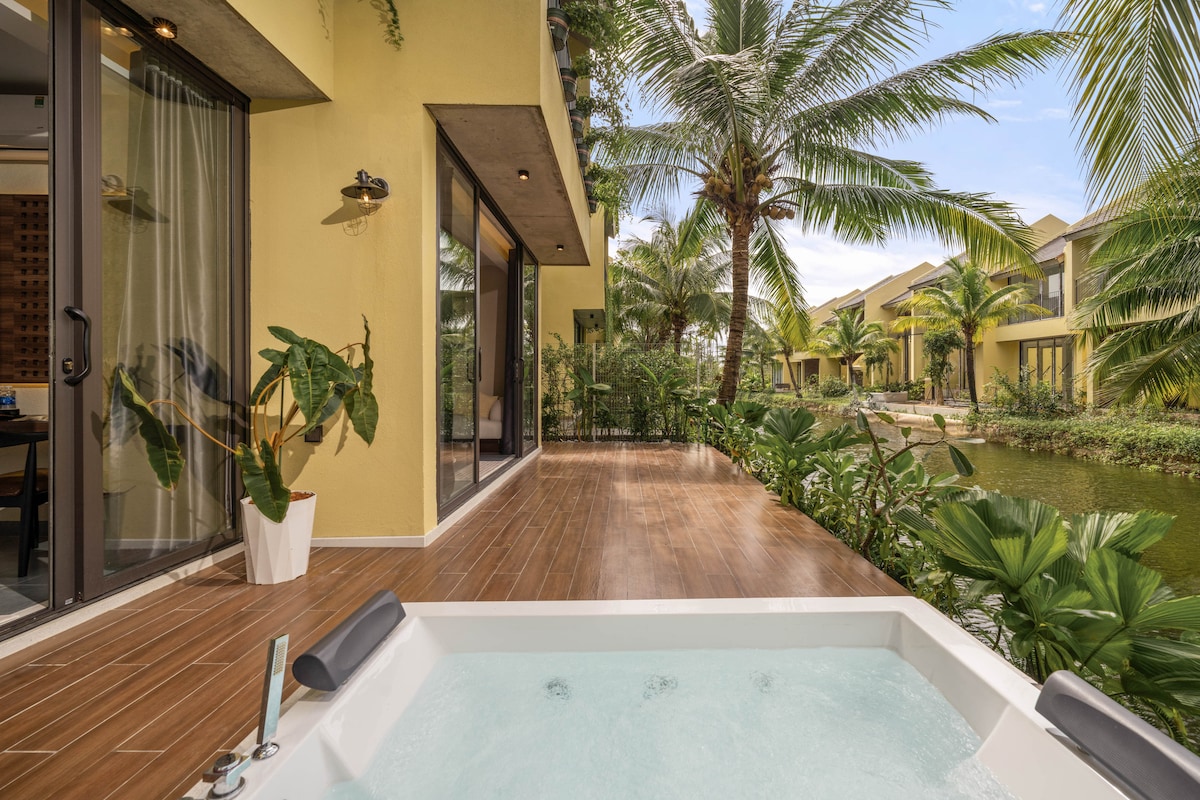 El apartamento 3-BDR es un testimonio de la estética mixta Wabi-Sabi y Boho, que celebra la belleza de la simplicidad, la imperfección y la naturaleza. El diseño de interiores cuenta con una relajante paleta de blancos y amarillos pálidos (estilo de Hoi An) , complementado con la naturaleza , creando un entorno sereno y armonioso. Nuestro objetivo es proporcionar un retiro tranquilo donde los huéspedes puedan descansar y relajarse. A pesar de su tamaño compacto, la mini despensa, 3 camas tamaño king, baños privados y un jacuzzi con vista al río en el exterior.