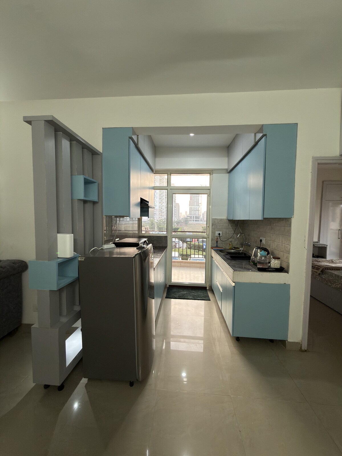 Descubre una comodidad inigualable en nuestra suite Boho chic de 1 dormitorio en Gurgaon. Disfruta de una acogedora sala de estar, una cocina bien equipada, un animado dormitorio, un baño moderno y un balcón con impresionantes vistas. Elegante sala de estar con libros, juegos de mesa, plantas y decoración boho chic. Sumérgete en el lujo con respaldo de energía completo y seguridad las 24 horas, los 7 días de la semana. Tu comodidad es nuestra prioridad: disfruta de una estancia donde cada detalle está diseñado para tu deleite. ¡Reserva ahora para disfrutar de una mezcla única de sofisticación y calidez!
