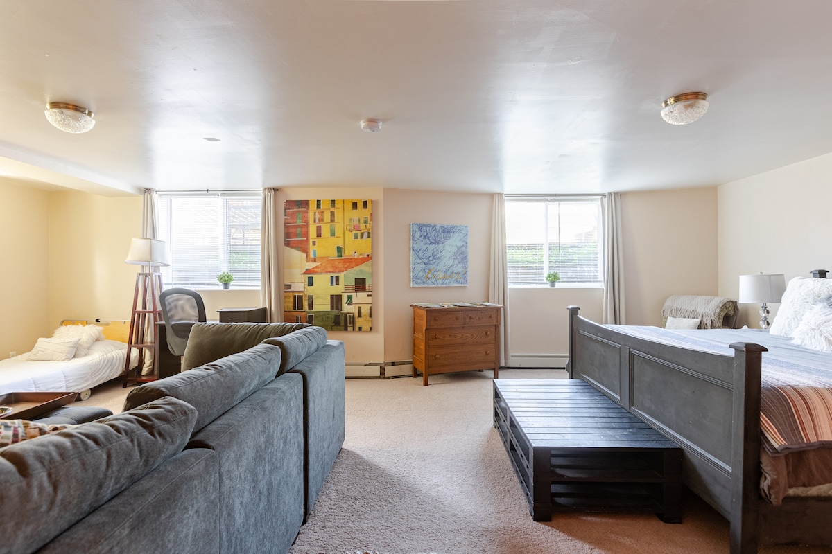 Entra por una entrada privada a este apartamento tipo estudio en el sótano. Construido recientemente en 2018, el espacio está bien iluminado, aislado y en un barrio tranquilo. Disfruta de un baño completo con lavandería y una pequeña cocina: nevera de 4,5 pies cúbicos, microondas, horno tostador extra grande, placa calefactora, olla de barro, ollas, sartenes, platos, cafetera keurig y fregadero de cocina completo. 1 cama tamaño queen con capacidad para dos personas. Los huéspedes deben tener al menos 3 evaluaciones positivas de estancias para reservar nuestro espacio.