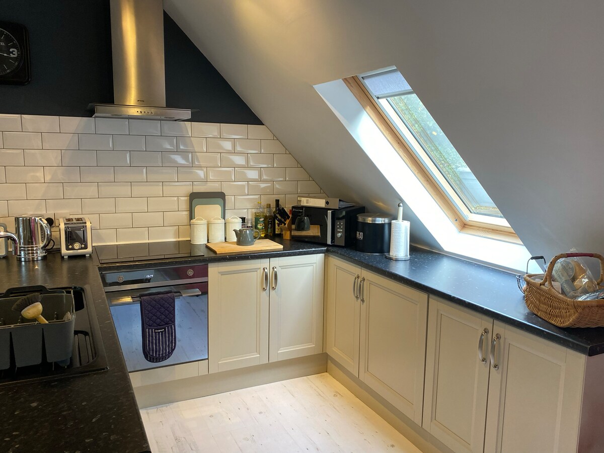 Encantador apartamento de planta abierta lleno de luz con grandes ventanales Velux. Pintorescas vistas al sur del viaducto de Cannington y detrás de una zona boscosa en pendiente frecuentada por ciervos, zorros, tejones y conejos. Numerosos paseos por el campo/costa en la puerta. En la costa jurásica, en una zona de excepcional belleza natural, en la frontera de Devon/Dorset. A 2 millas de la playa de Lyme Regis y a ½ milla de un pub y una tienda en Uplyme. A 1 milla de River Cottage HQ. Zona de estar al aire libre, espacio para guardar bicicletas, etc.