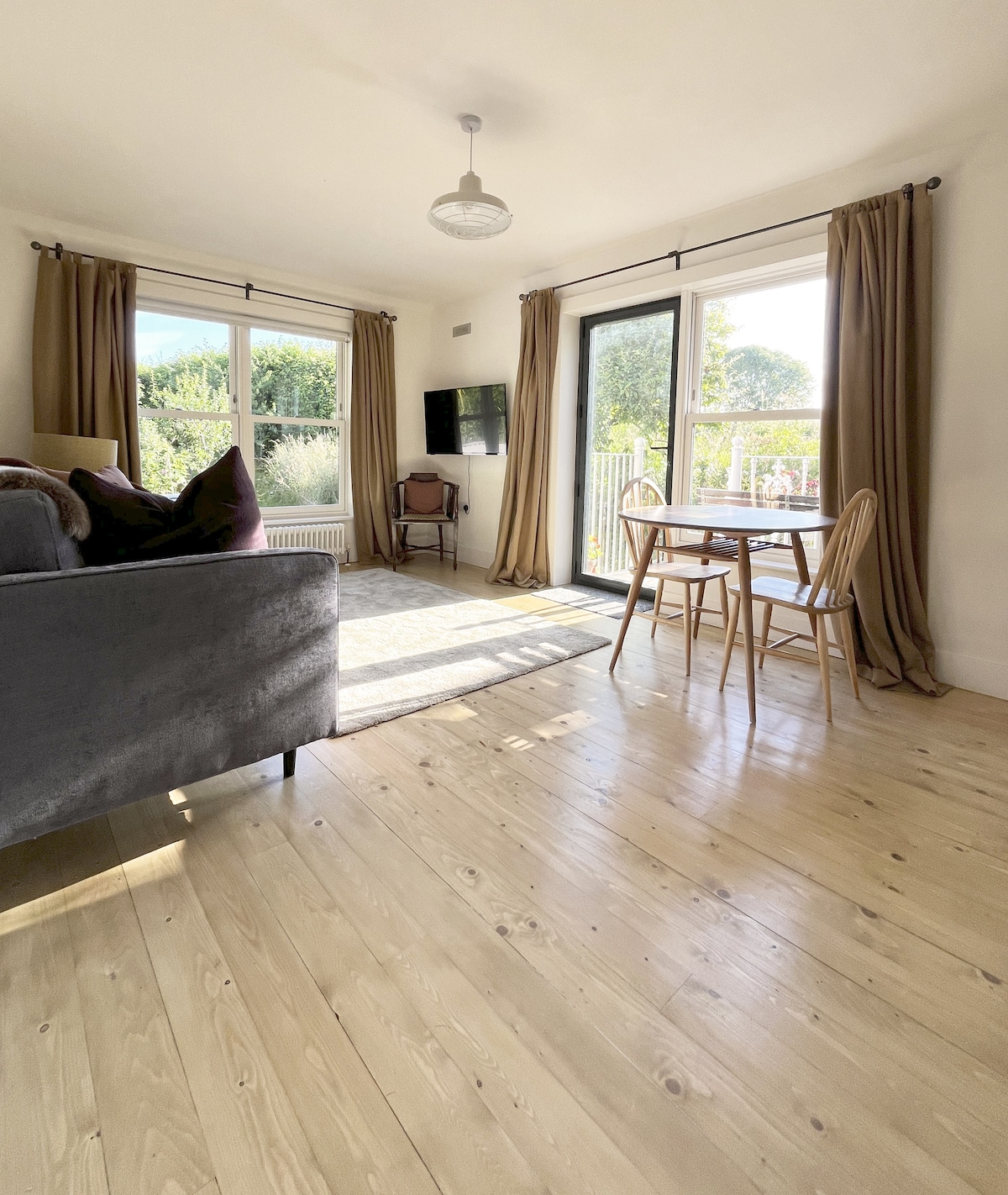 Te damos la bienvenida a nuestro tranquilo apartamento en el primer piso, recientemente reconvertido para el lujo tranquilo con icónicas piezas de diseño de mediados de siglo, hallazgos antiguos y obras de arte contemporáneo de tus anfitriones de artistas profesionales. Accesible a través de una amplia escalera de caracol, este refugio privado cuenta con una amplia y cómoda sala de estar con ventanas de doble hoja llenas de luz, un balcón con vistas idílicas al prado, una minicocina y un amplio dormitorio separado. Ideal para parejas, viajeros de negocios, lo siento, no bebés.