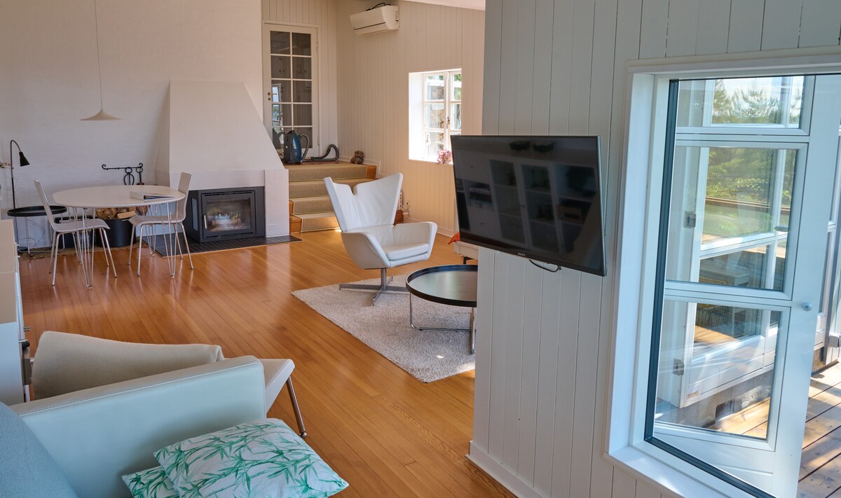 Nueva casa de campo de lujo de 115 m2, con 80 m a playa apta para niños. 3 dormitorios grandes. y 2 bonitos baños. Salón grande de 50 m2 que contiene cocina con lavabo/lavavajillas, mesa de comedor con espacio para 10 personas, acogedora zona de estar, estufa de leña y gran loft con vistas al mar. La sección de invitados tiene su propia entrada y baño. En el exterior hay una gran terraza con refugio y sol/luz desde la mañana hasta la noche. La casa está en una zona de campo densa y acogedora. Perfecto para 3 generaciones o dos amigos con niños
