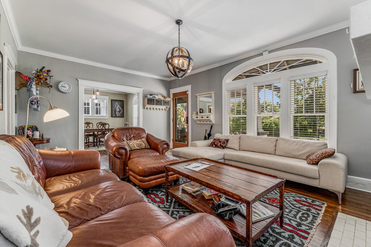 Hermoso bungalow histórico lleno de arte de dos dormitorios y dos baños. Amplio porche delantero más gran porche trasero con mosquitero. A poca distancia a pie del centro de la ciudad, actividades de Five Points, supermercados, bares y restaurantes. TEN EN CUENTA QUE las reglas de la casa deben leerse y aceptarse antes de reservar. Los propietarios viven en un espacio totalmente separado en la parte trasera de la propiedad que están disponibles, pero son muy respetuosos con tu privacidad. La casa no es apropiada para niños.