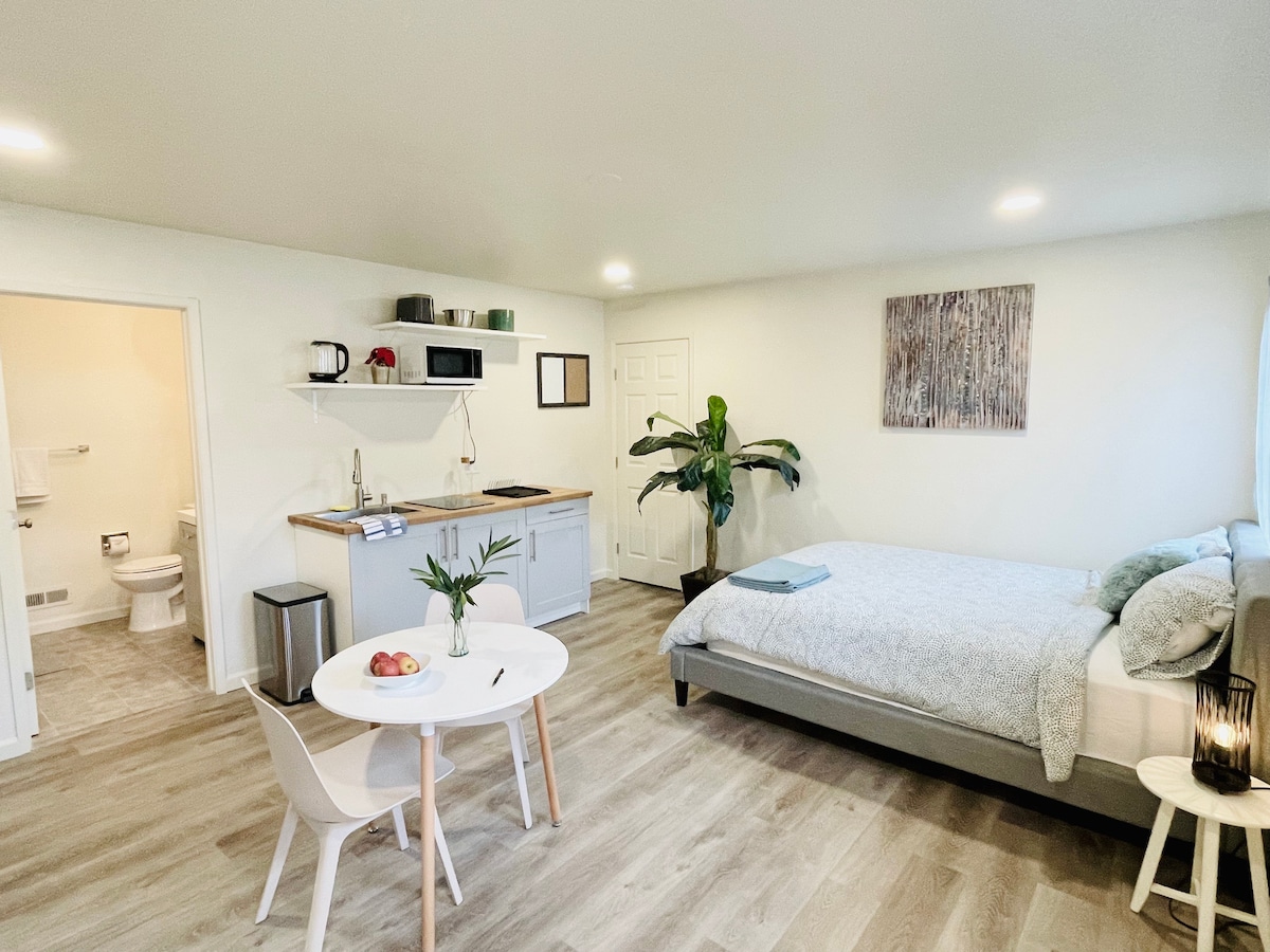 EL MEJOR Airbnb: estilo, comodidad, ubicación. Las tarifas de Airbnb y los impuestos TOT los paga el anfitrión, no el huésped. 1 dormitorio, hermoso baño, cocina completa, cafetera bien surtida, juego de comedor, cómodo sofá y otomana. Ducha de lujo: lluvia, cascada o de mano. Espejo con luz de fondo. Calentador Nest. Pisos de madera. Aire acondicionado portátil Dyson. Entrada privada. Luces de entrada automáticas en la pasarela, enrejado de glicinias. Estacionamiento dedicado. Jardín de verduras y frutas orgánicas. Patio.