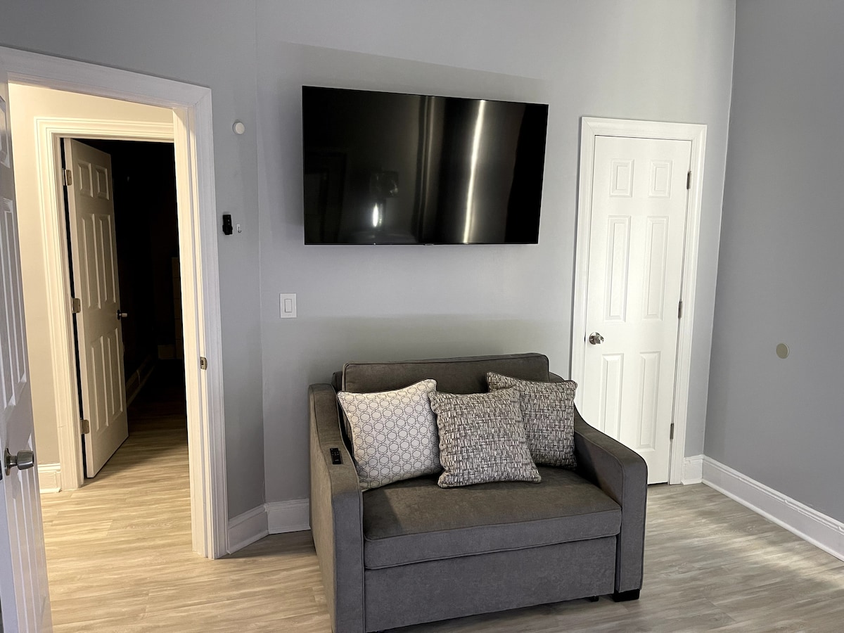The space is on the ground level its about 600 square feet. Best part is its right next to the inground pool. The pool is 4-7 feet deep with a lounge area. On the ground floor we have a newly renovated kitchen (no oven), seating for 6-7 people, small dinner table, Flatscreen TV, Sectional sofa, and full bathroom. The bedroom in the lower level is about 600 sqft. In the bedroom you will find two queen size Memory Foam beds with top of the line linens. We do allow pets with a $75 pet fee.