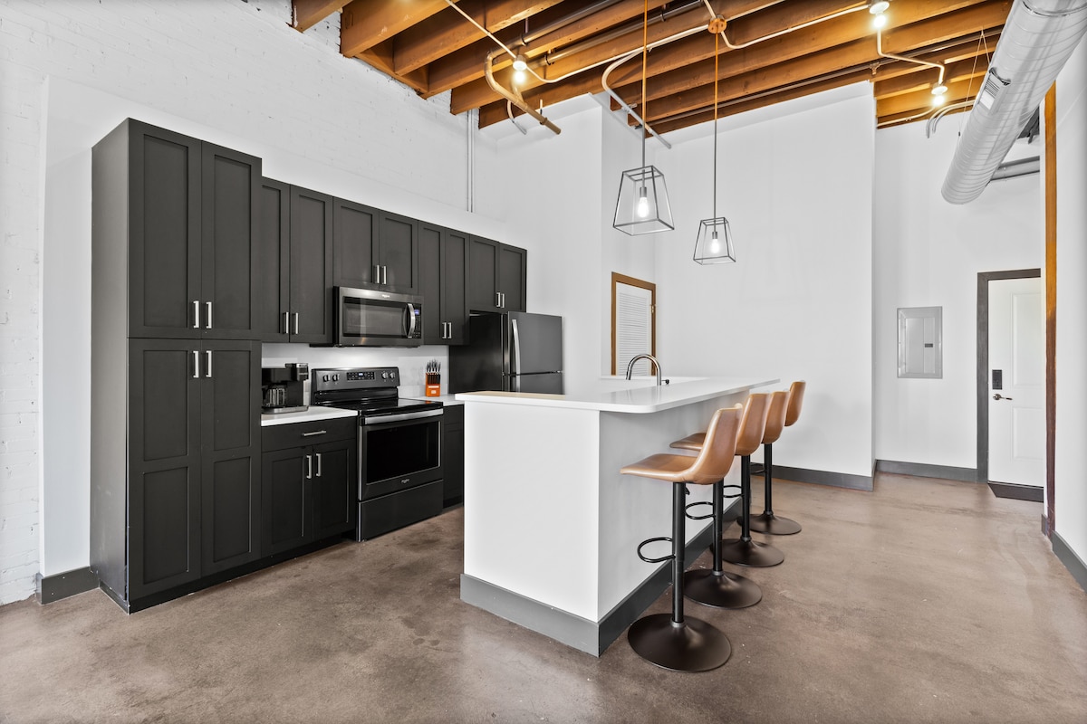 El Echelon es un magnífico loft de 1 dormitorio/1 baño diseñado con buen gusto con techos de 12 pies + ventanas de marco de acero de 7 pies y una cocina totalmente equipada. Comienza tu estancia con un café recién hecho y un bocado del minimercado de abajo. Pasa la tarde descansando al sol junto a la piscina o desafía a tus amigos en la terraza de juegos de la azotea. Asa algunos perritos al atardecer y toma un corto viaje en Uber al estadio para un juego de Cards, o mejora con filetes en Carmine's y un espectáculo en el famoso Fox Theatre