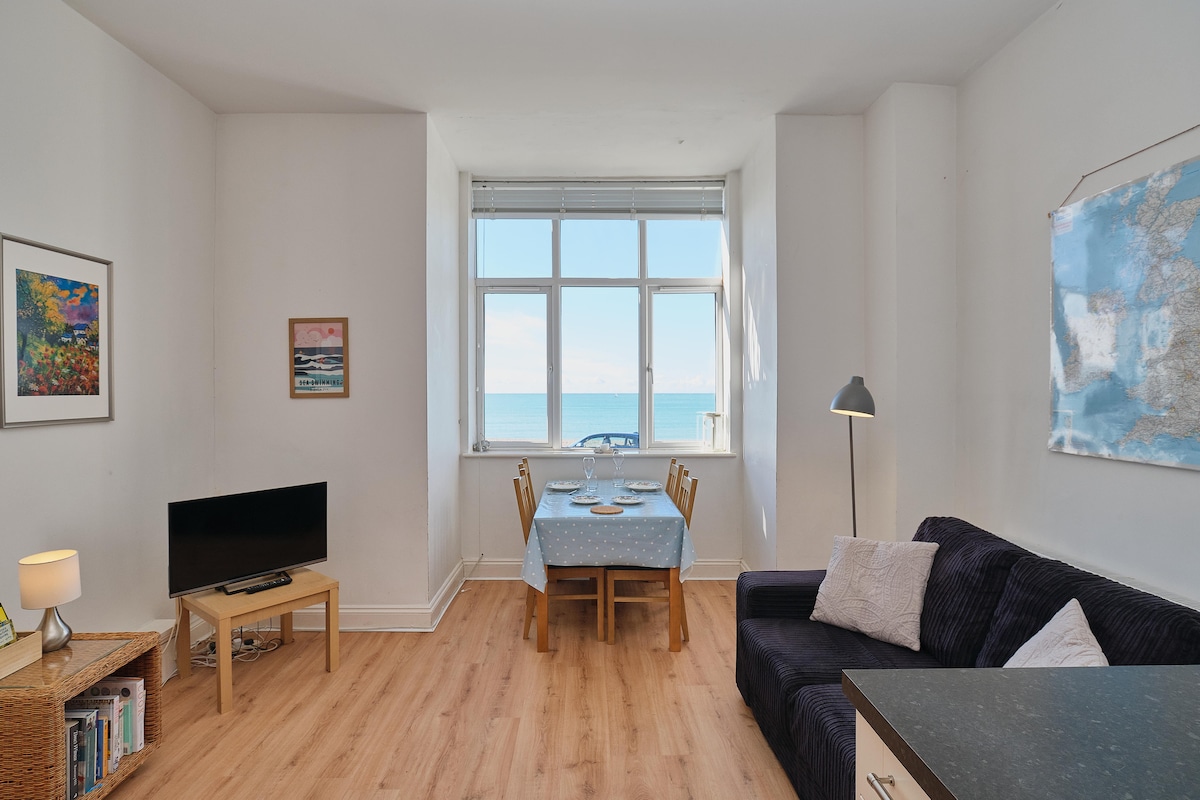 Un apartamento bien equipado en la planta baja junto al mar con vistas al mar, con el mar a solo 10 metros de distancia, un dormitorio bien equipado, un baño con bañera y ducha, amplio salón con características originales y techos altos, incluida la cornisa victoriana, a poca distancia a pie del tenis, teatros, pubs, restaurantes, tiendas en un edificio victoriano tranquilo que puede alojar hasta tres huéspedes. Estacionamiento de pago disponible (estos se cobran localmente) También tenemos un sofá cama para uno en el salón.