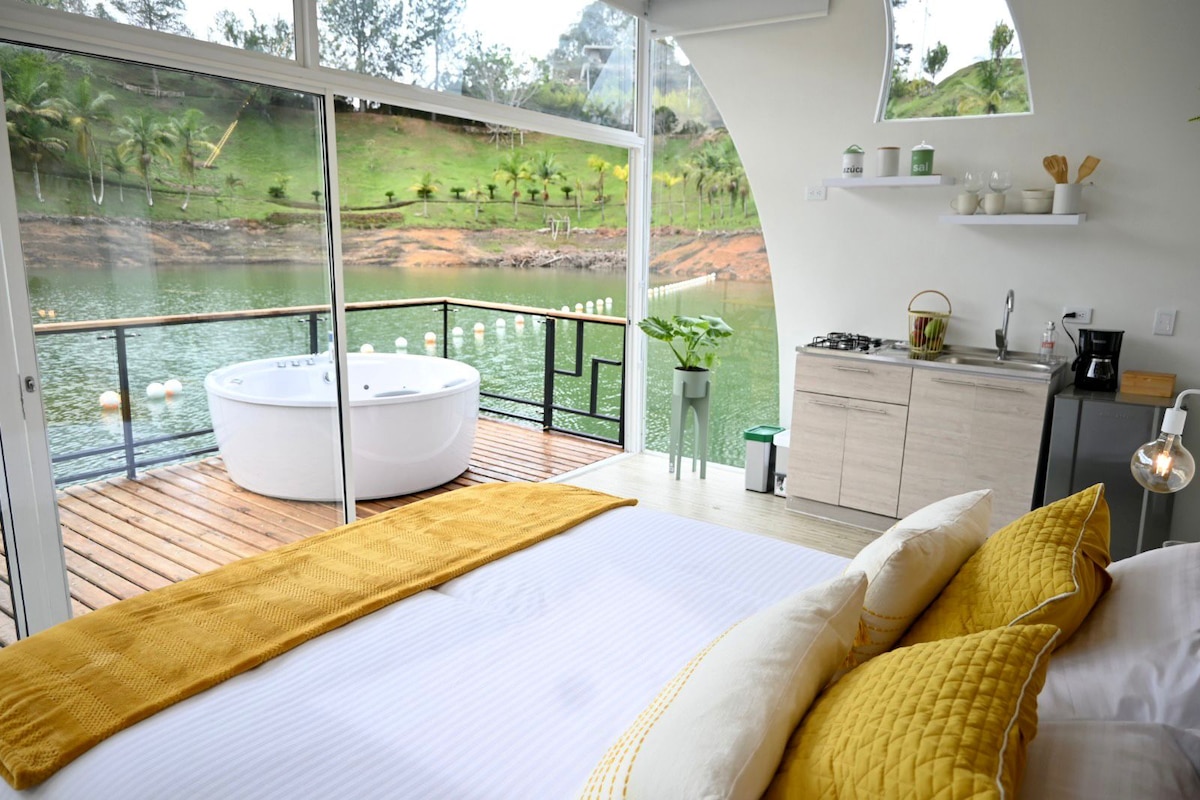 🥘 Servicio a la habitación con cocina local 🍳 Desayuno incluido 🌐 WiFi de fibra óptica para mantenerte conectado 🛁 Jacuzzi privado con vista espectacular al embalse 📺 Smart TV 🚗 Parqueadero gratuito y vía pavimentada 🚣♀️ Kayak y paddle board incluidos para explorar el embalse 🐦 Avistamiento de aves desde tu terraza 📍 Frente al lago, a 15 min de la Piedra del Peñol y 18 min de Guatapé.